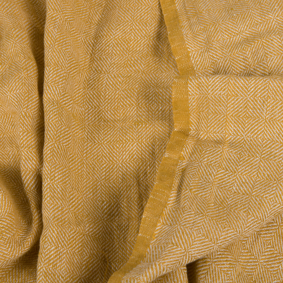 Prana tkanina lniana wytkana we wzór rombów z przędzy żółtej (kolor musztardy) i białej. Mocna, gęsta, średnio ciężka tkanina lniana. Po praniu tkanina jest miękka, lekko gnieciona, nie ściągnie się.