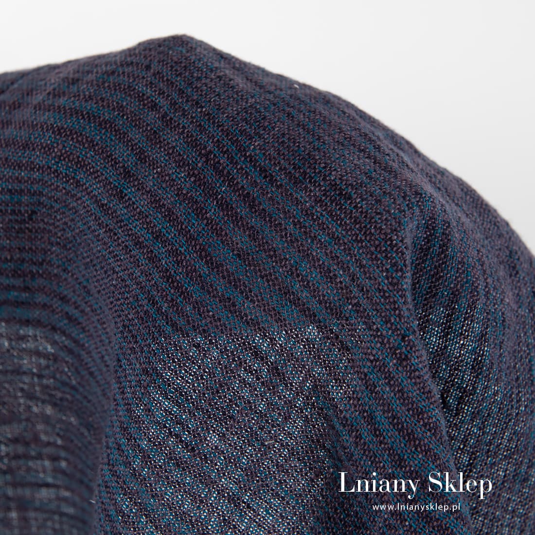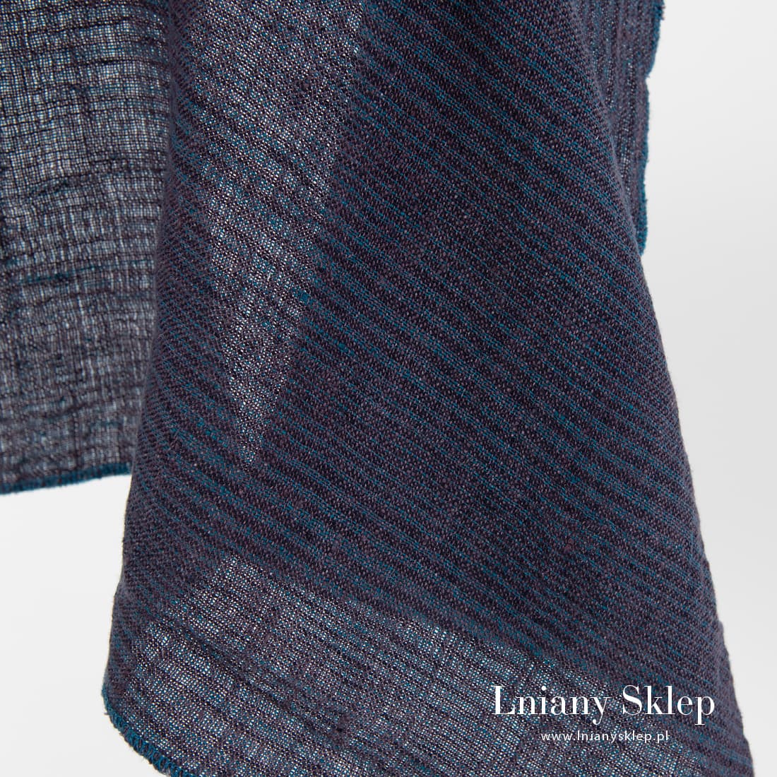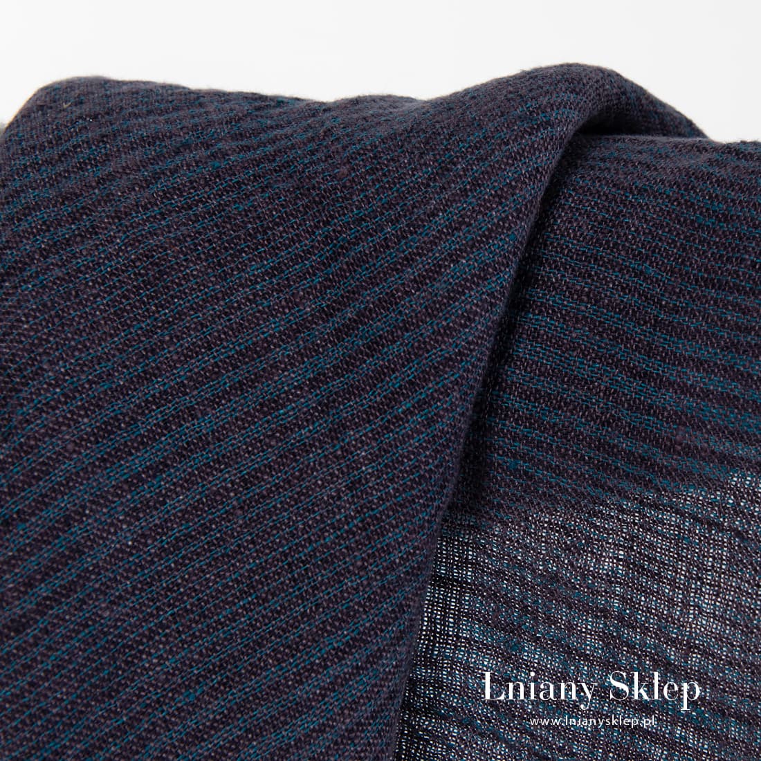 Prana tkanina w paski fioletowe i granatowe o turkusowym odcieniu. Paski zostały wytkane poziomo. Po poddaniu praniu tkanina stała się miękka i przytulna w dotyku. Już się nie ściągnie.