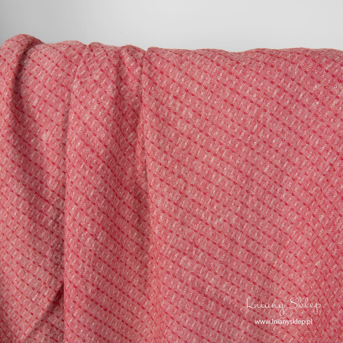 Prany czerwony melażowy len we wzorki. Melanżowe tło tkaniny wytkane z przędzy czerwonej i jasnoszarej ozdobione jest wzorkiem malutkich rombów. Mocna, gęsta, średniociężka tkanina dekatyzowana tkanina 100% lniana jest mięciutka, a po kolejnych praniach się nie skurczy.