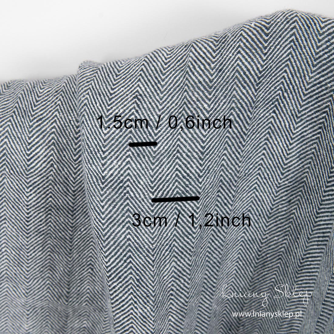Prany len granatowa i biała jodełka wytkana splotem jodełkowym z granatowej i mlecznobiałej (o lekko żółtawym odcieniu) przędzy. Gęsto wytkana, przyjemna w dotyku, mięciutka po praniu tkanina na szycie odzieży, zasłon, narzut na łóżka, poszewek dekoracyjnych na poduszki, fartuchów i in. produktów.