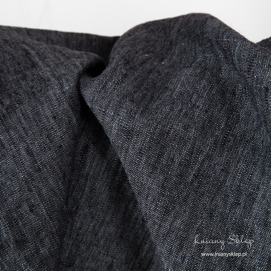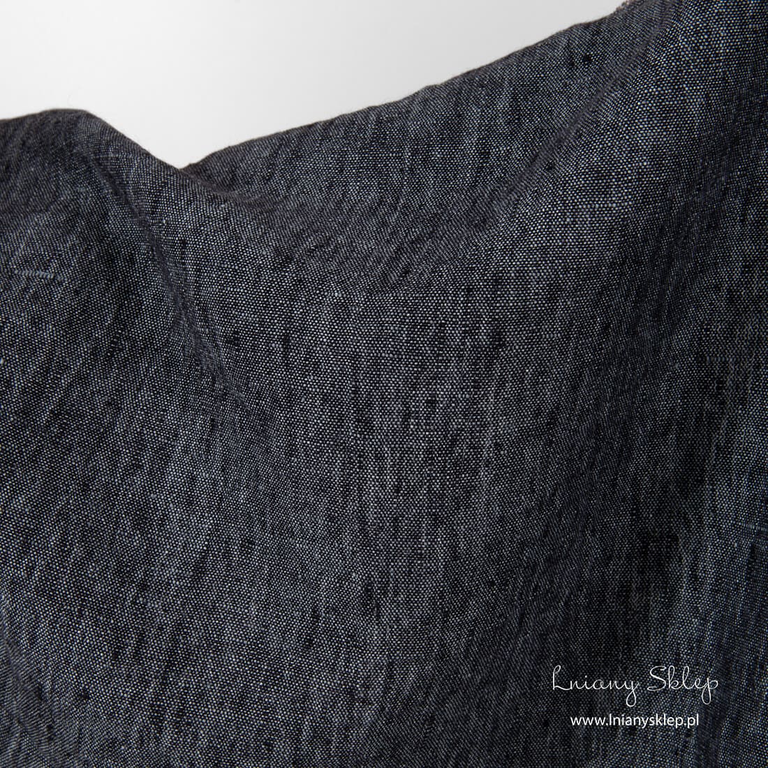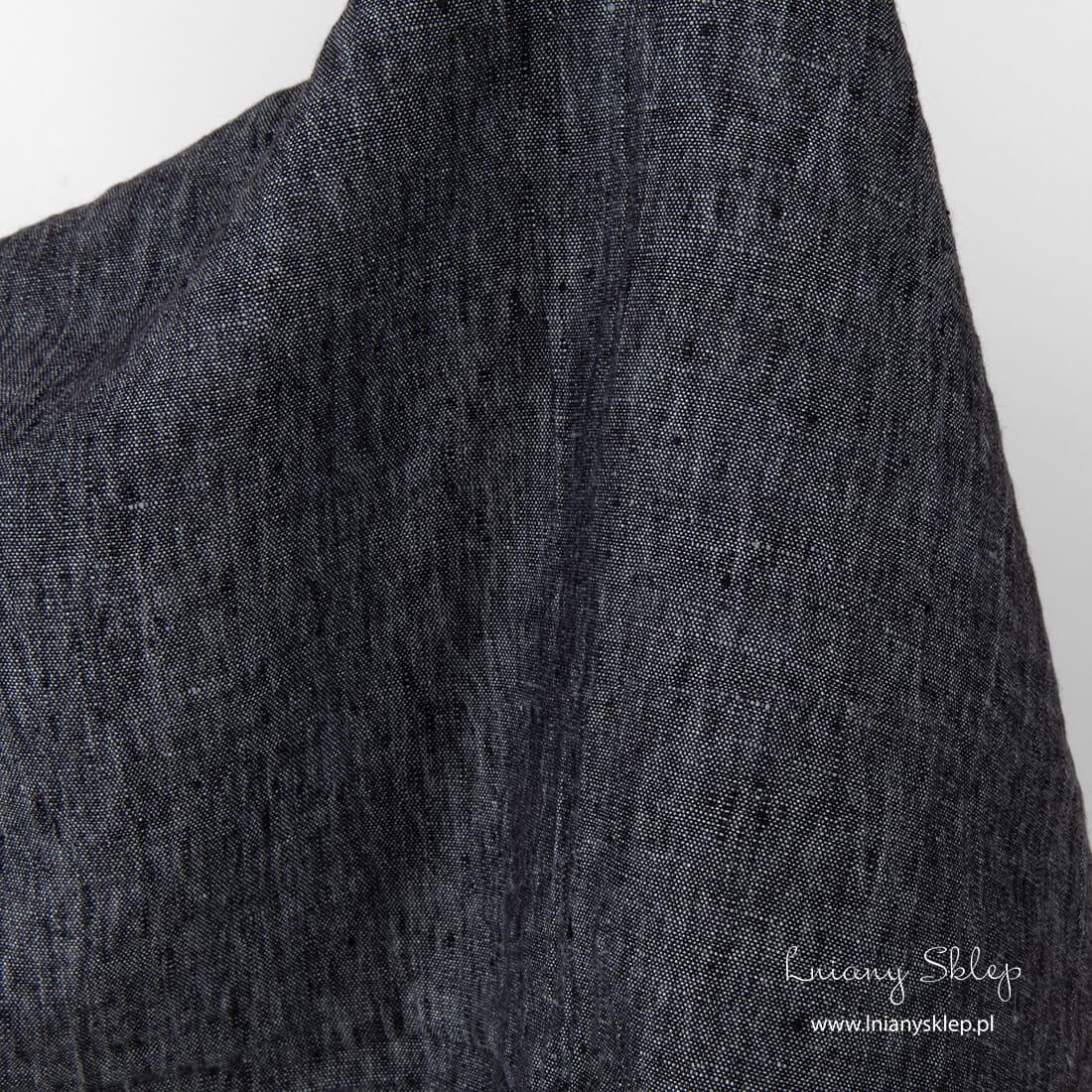 Prany len melanż czarny i szary. Użyte przędze: czarna i szara o niebieskim odcieniu. Gęsta, dość ciężka dekatyzowana tkanina jest mięciutka, a po kolejnych praniach się nie skurczy. Tkanina 100% lniana.