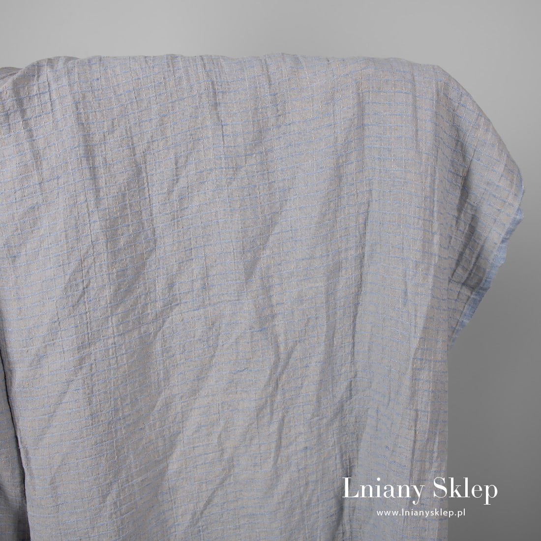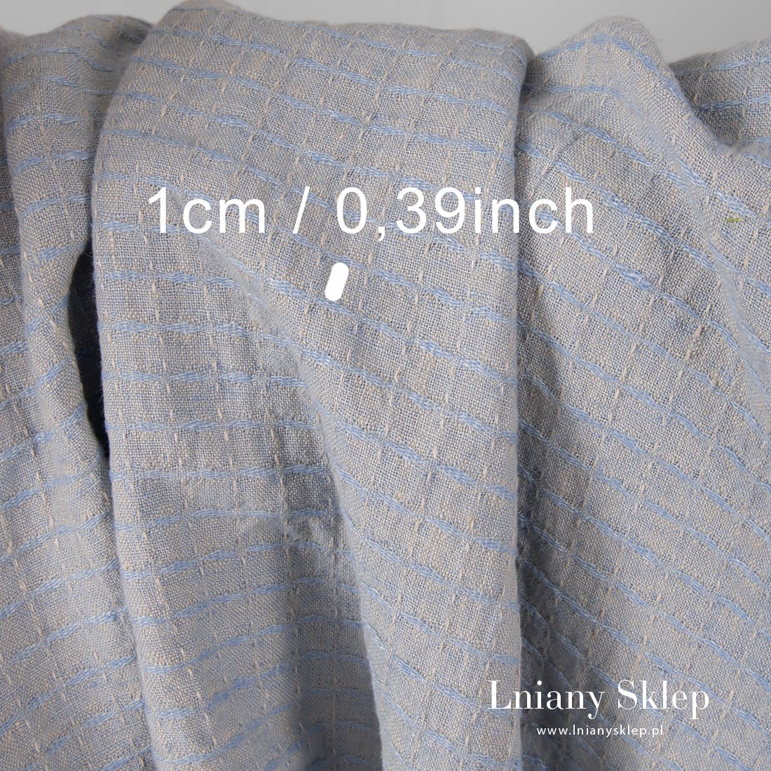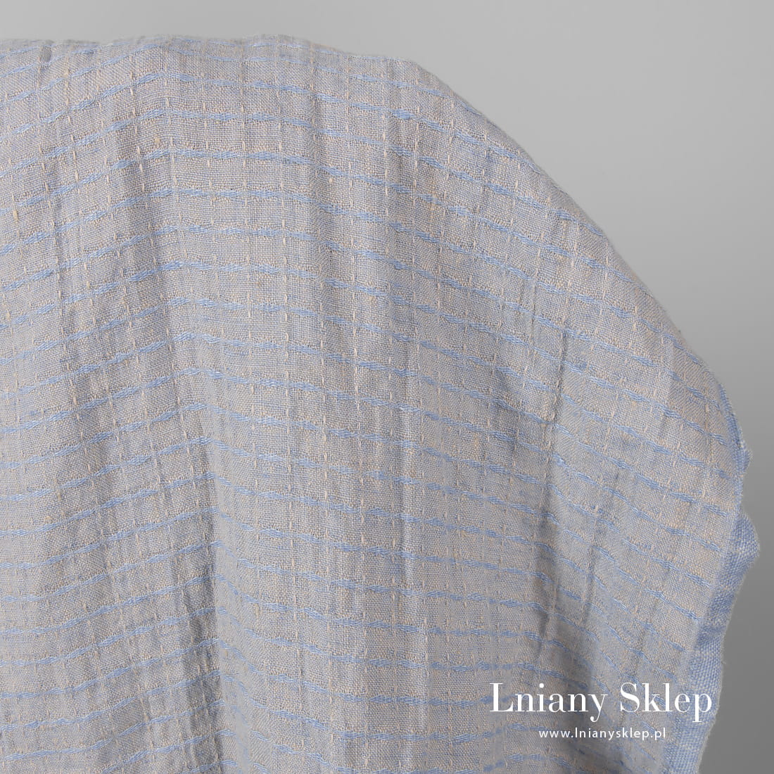 Prany len wytkany w niebieską krateczkę na piaskowym tle. Na krateczkę układa się rysunek wytkanych wydłużonych rombów i przerywanych linii. Mocny i gęsty, średnio ciężki i gruby len po praniu jest mięciutki. Ma gniecioną fakturę.