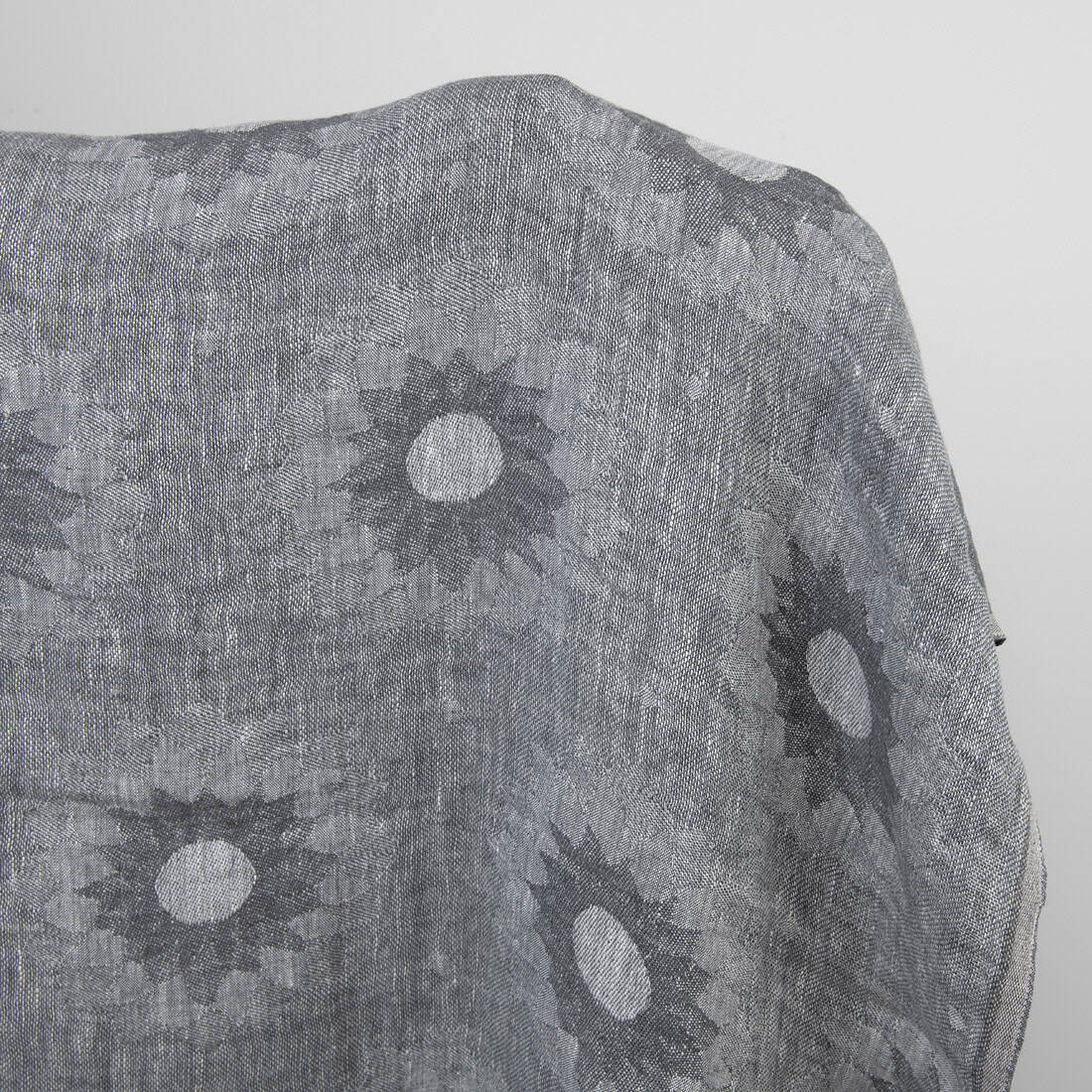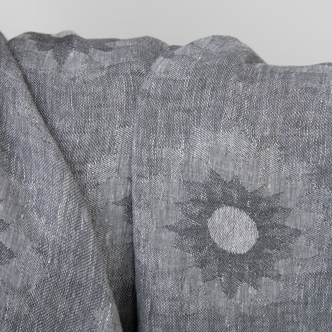 Prany szary żakardowy len w kwiaty. Do wytkania tej tkaniny użyto przędzy białej i szarej. Tkanina została poddana praniu, dlatego jest miękka, a po kolejnych praniach już się nie ściągnie.
