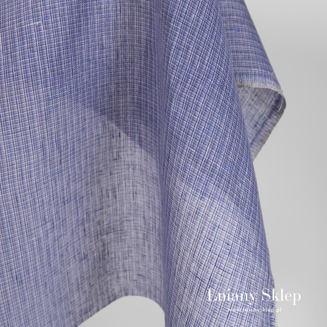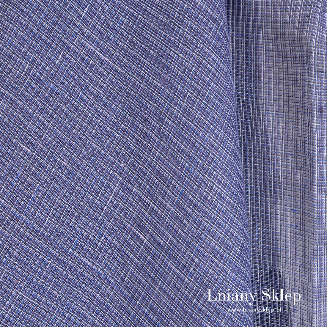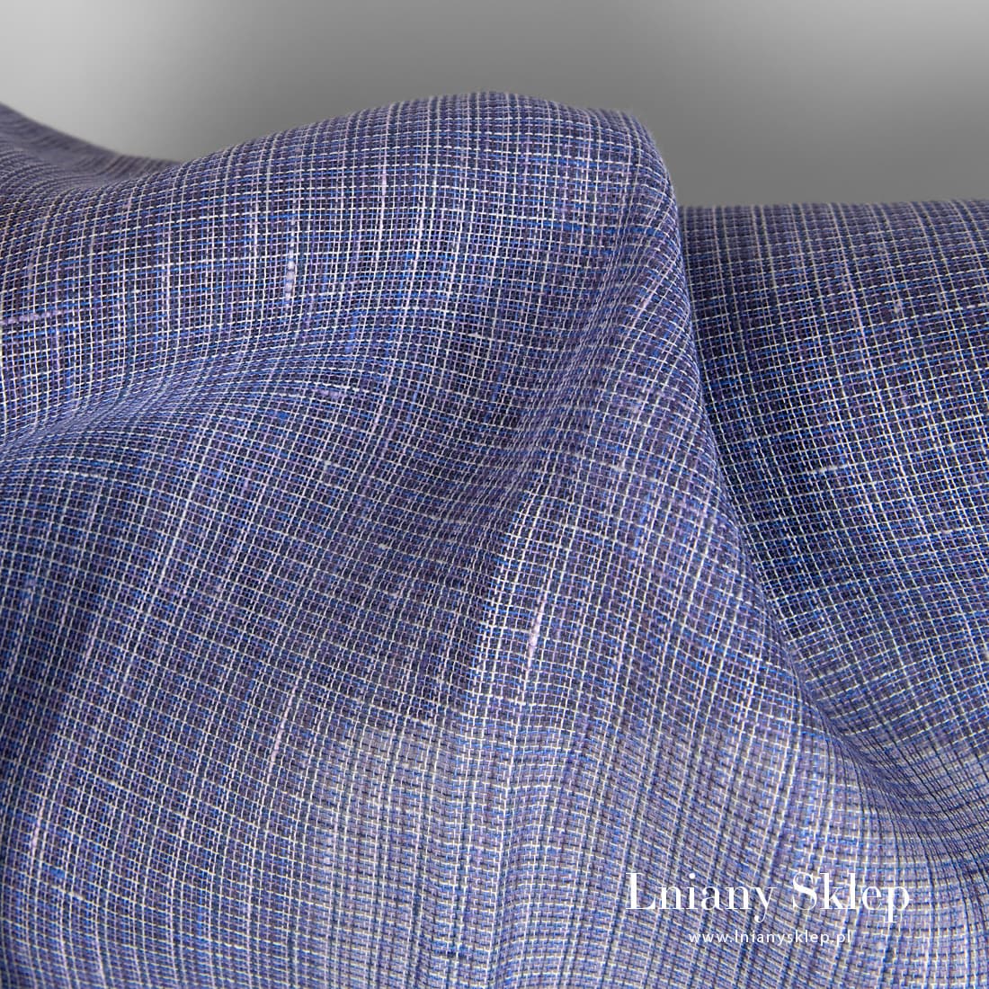 Przeźroczysty fioletowy w krateczkę len wytkany z przędz o kilku fioletowych odcieniach oraz szarej i niebieskiej. Rzadko tkana, leciutka tkanina na szycie szaliczków, firanek i elementów dekoracyjnych.