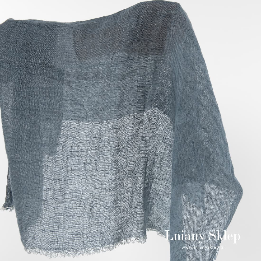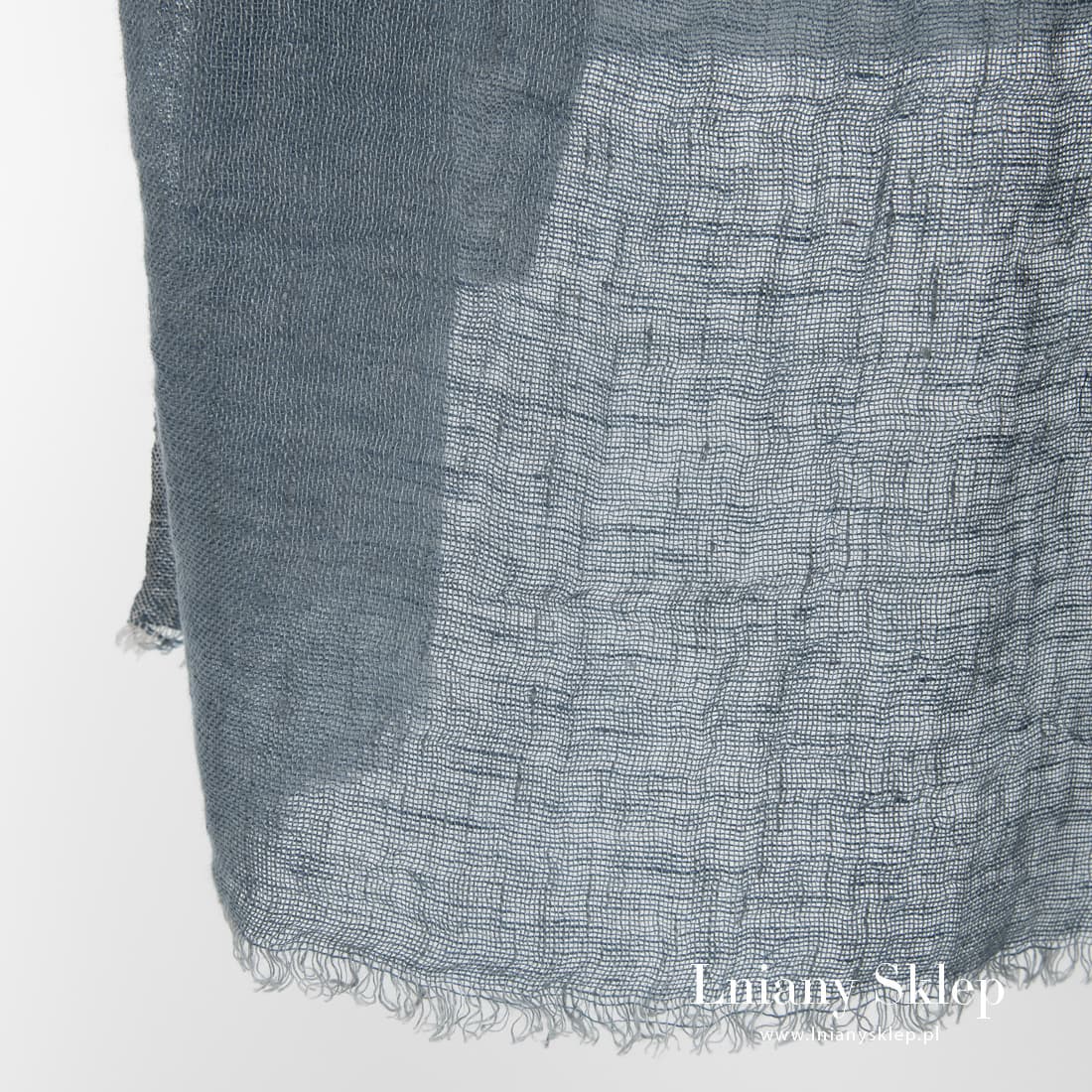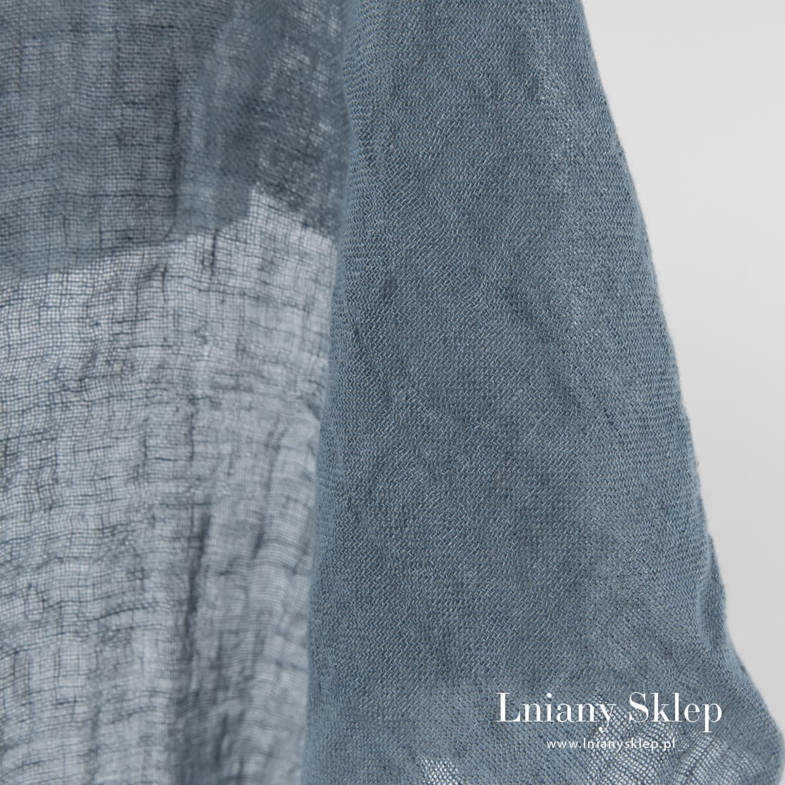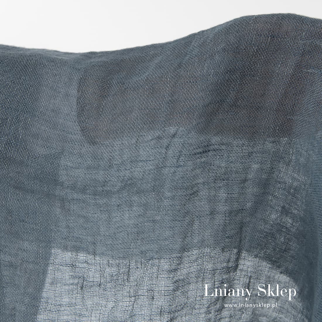 Przeźroczysty prany melanżowy szary len o niebieskim odcieniu wytkany z dwóch przędz: szarej i niebieskiej. Lekki, rzadko tkany. Po praniu miękki i przyjemny w dotyku. Pasuje na szycie szaliczków, firanek i innych leciutkich produktów.