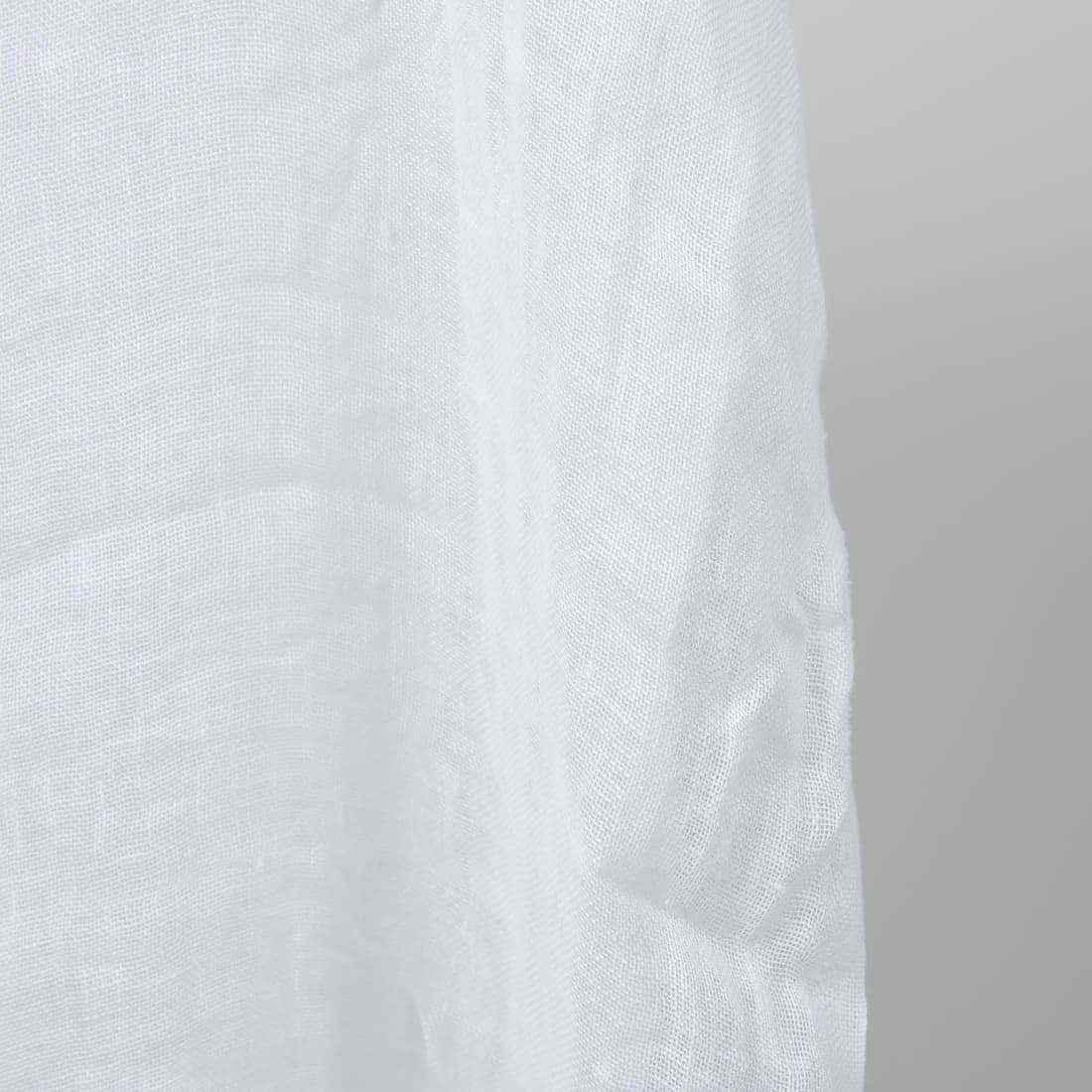 Leciutka, prana, przeźroczysta, rzadko tkana, biała (optyczna, śnieżna biel) tkanina lniana. Tkaninę poddano praniu w procesie produkcji – jest miękka, ma lekko gniecioną fakturę. Idealna na szycie np. szaliczków.