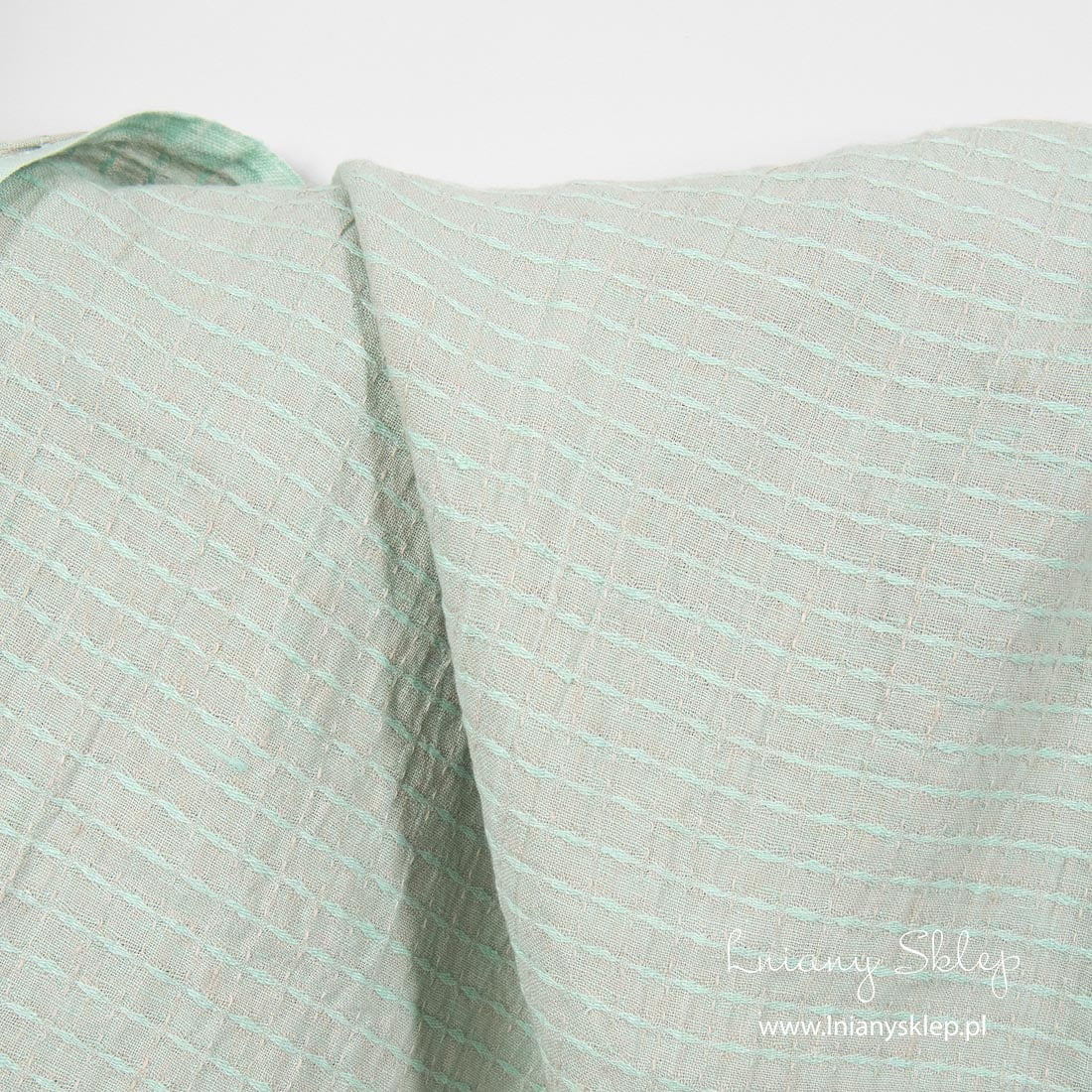 Tkanina lniana zielone wzory prana wytkana z jasnozielonej (kolor mięty) i piaskowej przędzy. Wytkane wzory układają się w okienka 1cm x 1 cm. Gęsta, średnio gruba, przyjemna w dotyku, mięciutka po praniu. Tkanina na szycie najróżniejszych produktów tekstyliów domowych i ubrań.
