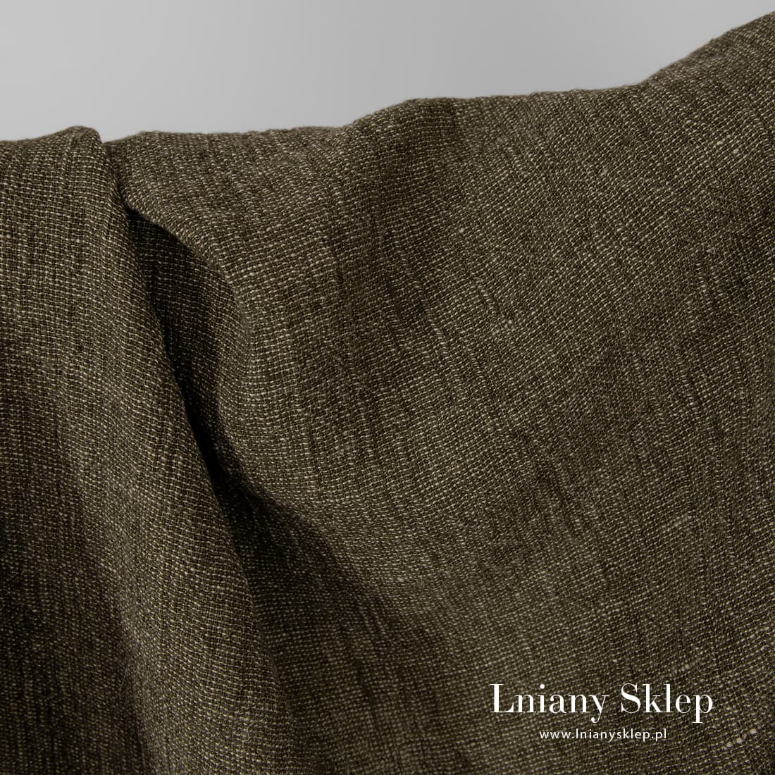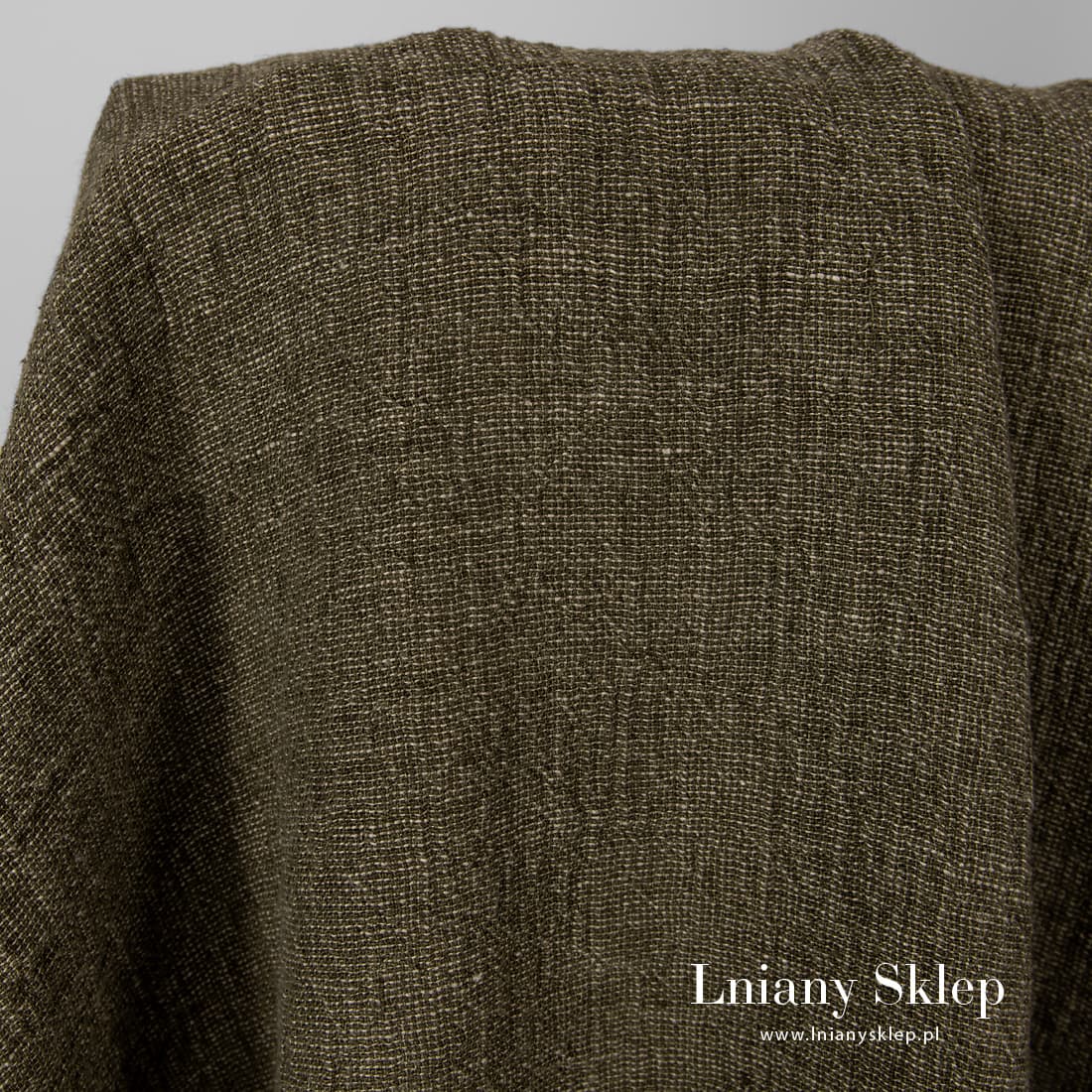 Tkanina prana lniana zielona w szare kreseczki z niebarwionego lnu. Dość gruby, mocny, gęsty, ciężki len 100%. Poddany w trakcie produkcji praniu len staje się miękki i więcej się nie ściągnie. Pasuje na szycie ubrań, tekstyliów domowych.