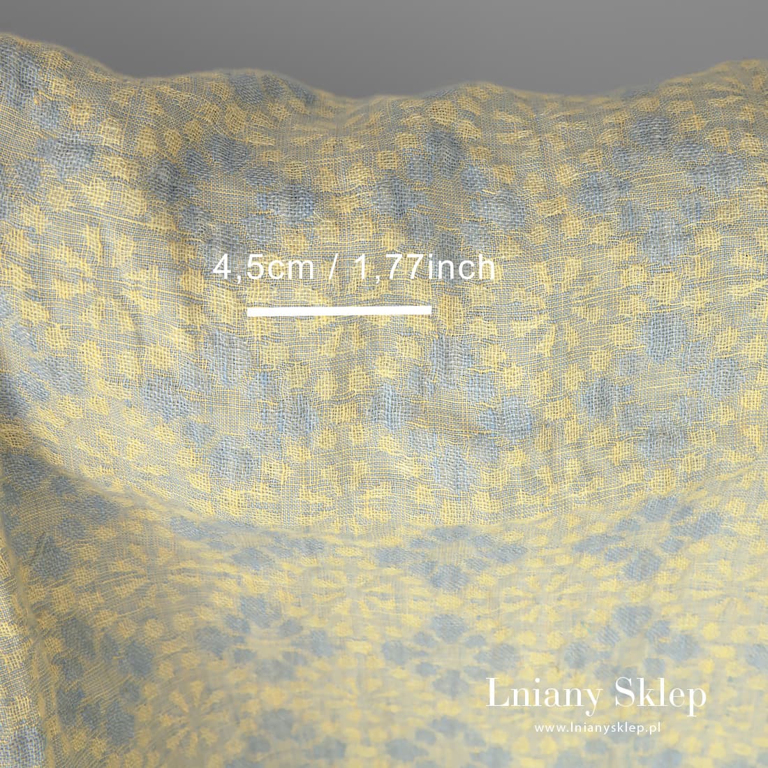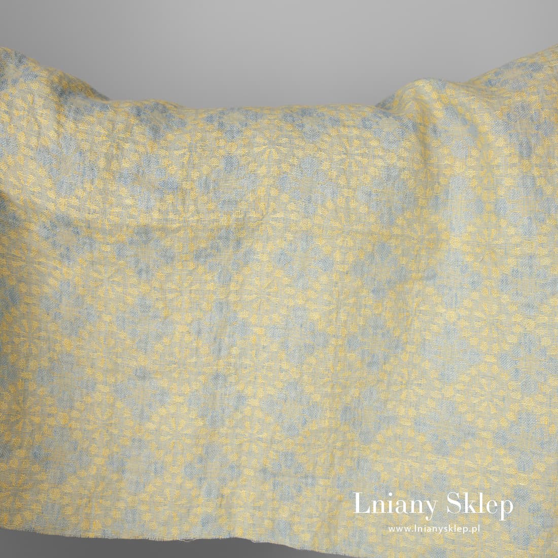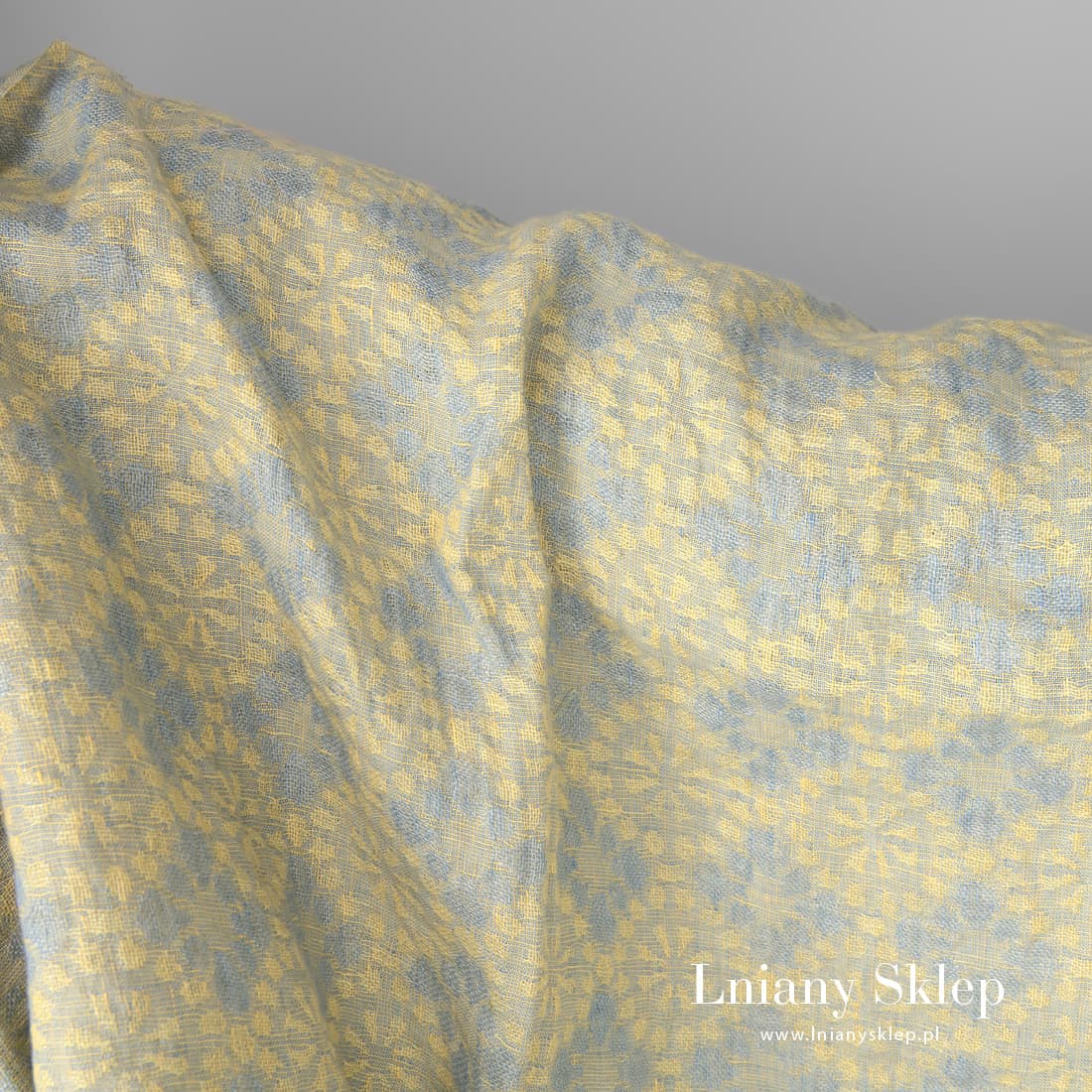 Żakardowa poddana dodatkowej obróbce - praniu tkanina lniana. Prana tkanina jest bardziej miękka i już się nie skurczy przy późniejszych praniach. Żółte tło ozdobione zostało wytkanym deseniem delikatnych niebieskich kwiatów. Piękna pastelowa tkanina. Można z niej uszyć akcesoria, suknię albo coś z konfekcji domowej.