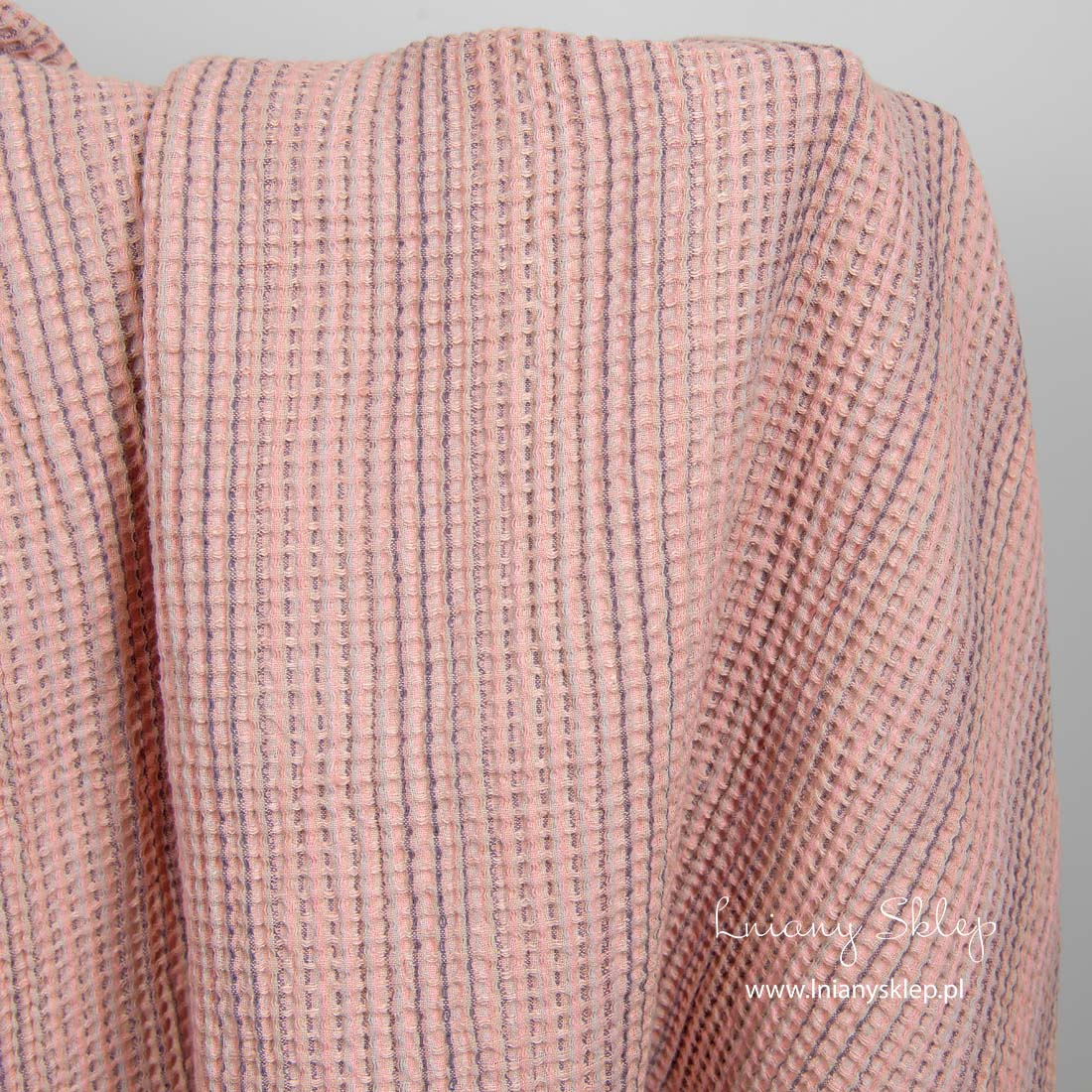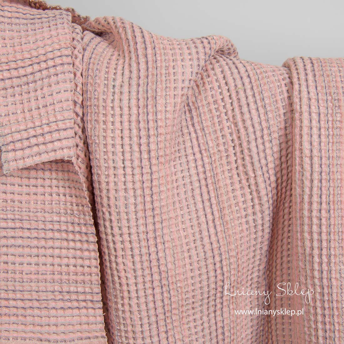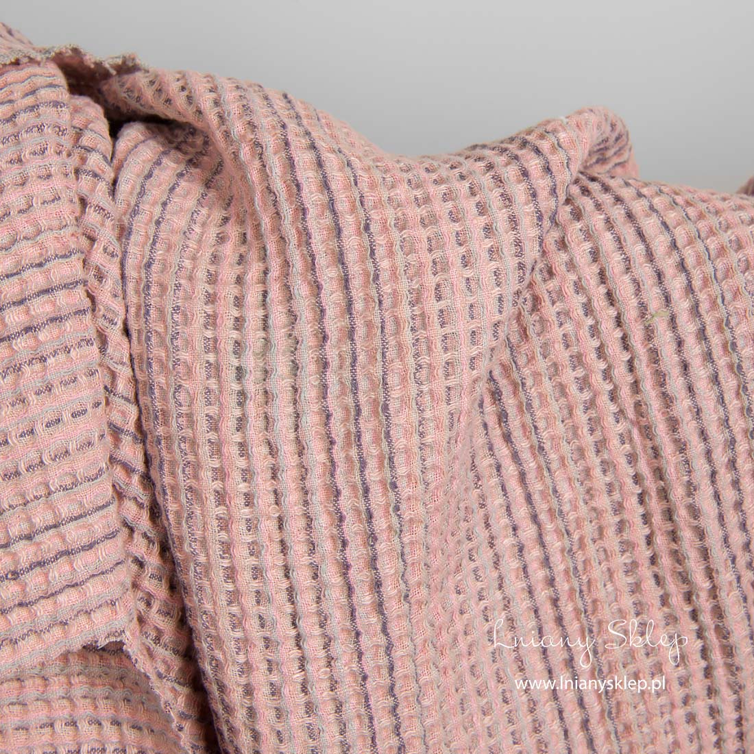 Lniano - bawełniana tkanina prana różowa splot waflowy. Nieco upstrzyliśmy tkaninę wplatając pionowo biegnące paski jasnoszare, jaskraworóżowe, niebieskawe, fioletowe i liliowe. Po praniu miękka i puszysta. Bardzo pasuje na szycie produktów kąpielowych: ręczników, szlafroków itp.