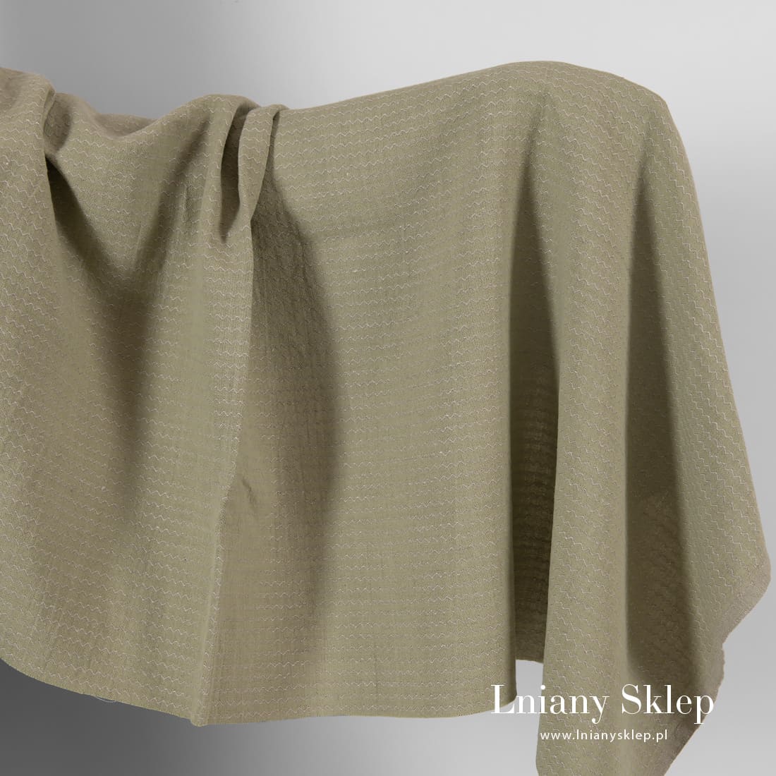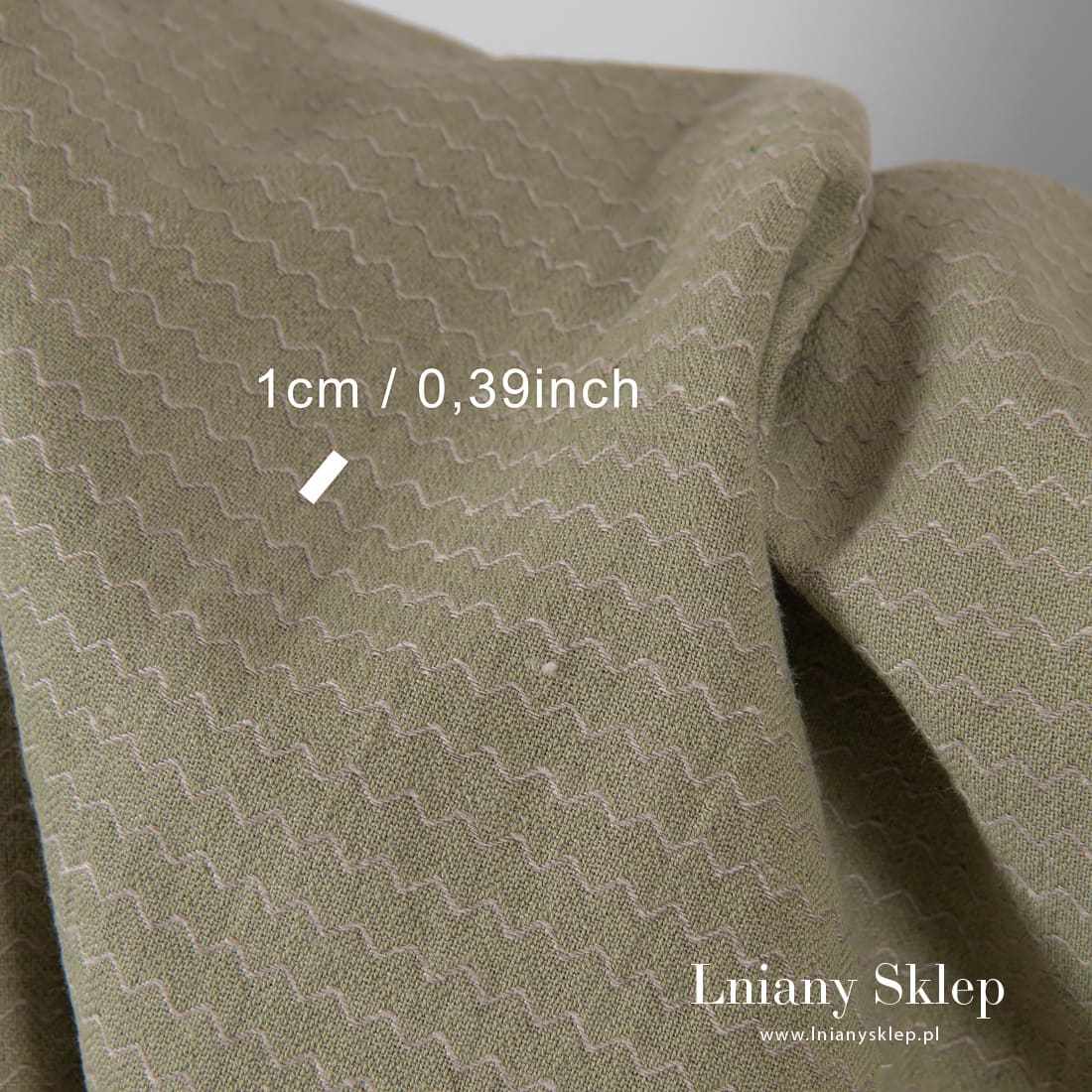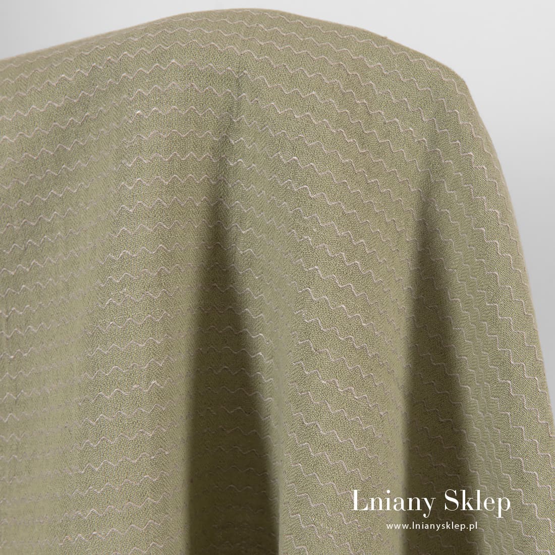 Lniano - bawełniana tkanina prana zielona we wzór fali wytkanej z niebarwionej (szarej o piaskowym odcieniu) przędzy lnianej. Mocna, gęsta, średnio ciężka, ozdobnie wytkana w drobny, sympatyczny rzucik tkanina została w procesie produkcji poddana praniu – jest miękka i ma lekko gniecioną fakturę. Pasuje na szycie najróżniejszych produktów: ubrań, tekstyliów domowych i in.