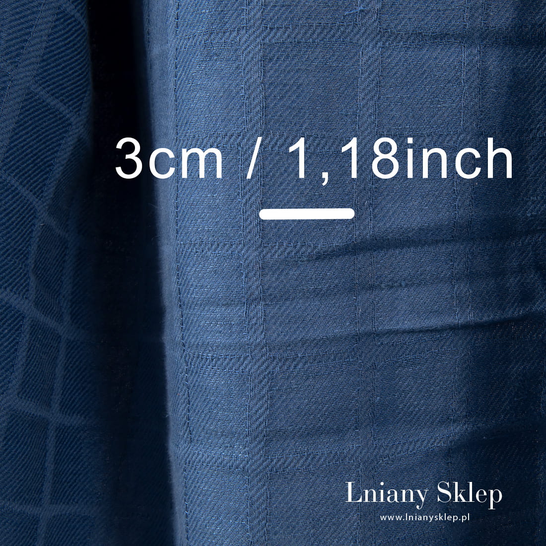 Niebieski w kratkę prany len z domieszką bawełny. Tkanina wytkana splotem skośnym w wypukły wzorek, który się układa w rysunek kratki. Mocna, gęsta, średnio ciężka tkanina. Po praniu miękka i przytulna.