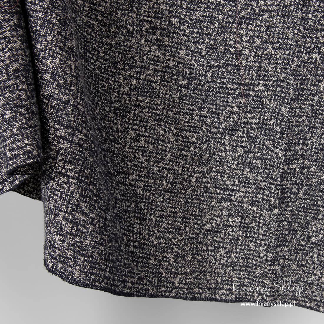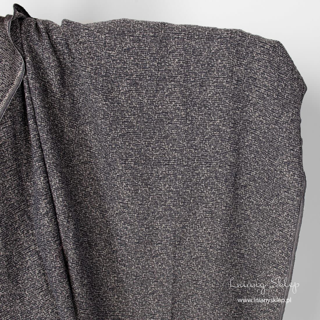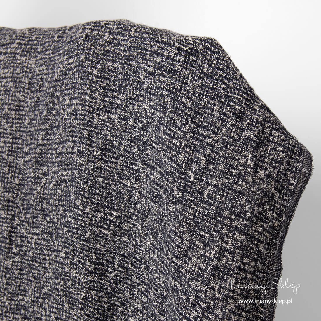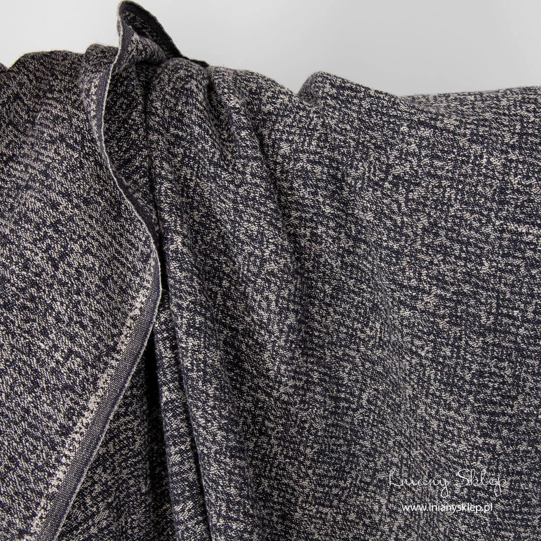 Prana czarna tkanina melanżowa len z domieszką wytkana z czarnej bawełnianej i niebarwionej (szarej o piaskowym odcieniu) lnianej przędzy. Gęsta, mocna tkanina przypomina dzianinę. Po dekatyzacji (praniu) stała się miękka i już więcej się nie ściągnie. Na szycie odzieży, szalików i tekstyliów domowych.
