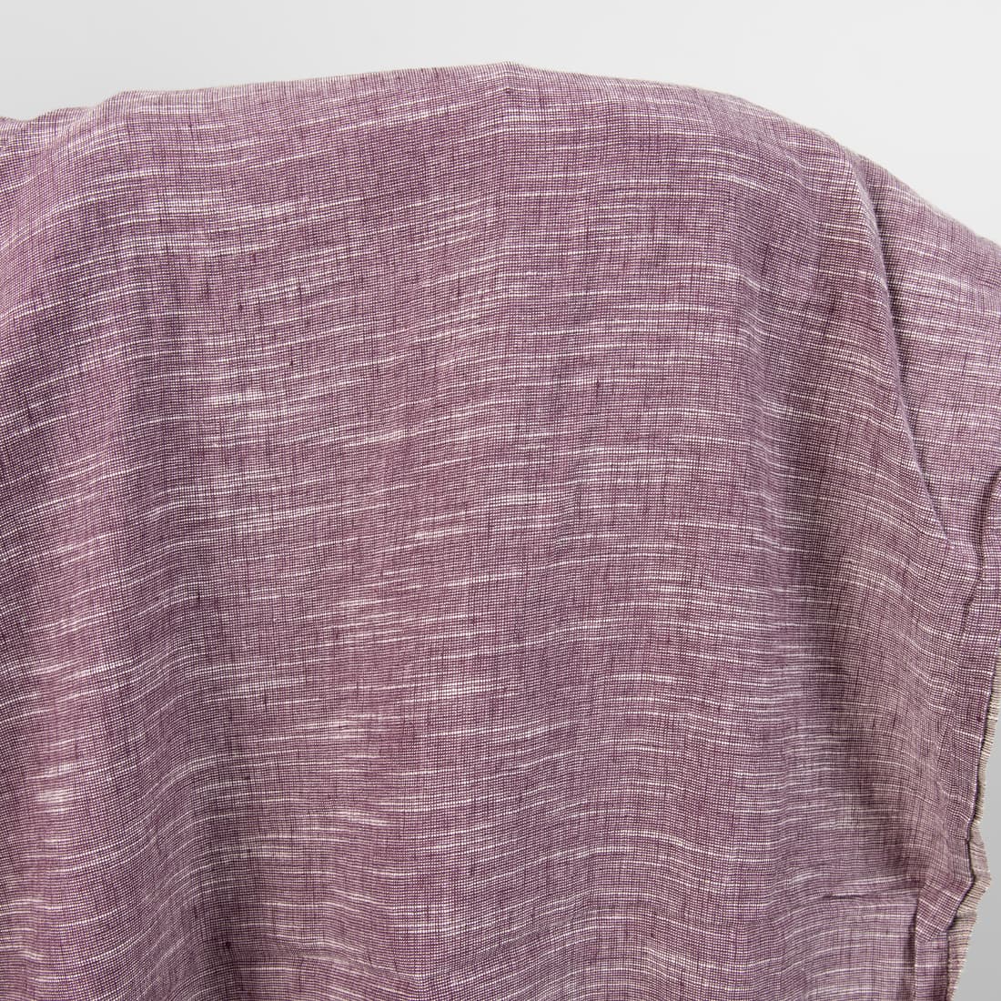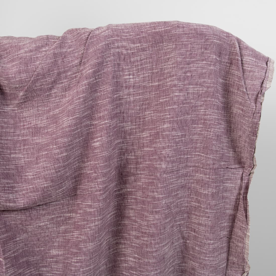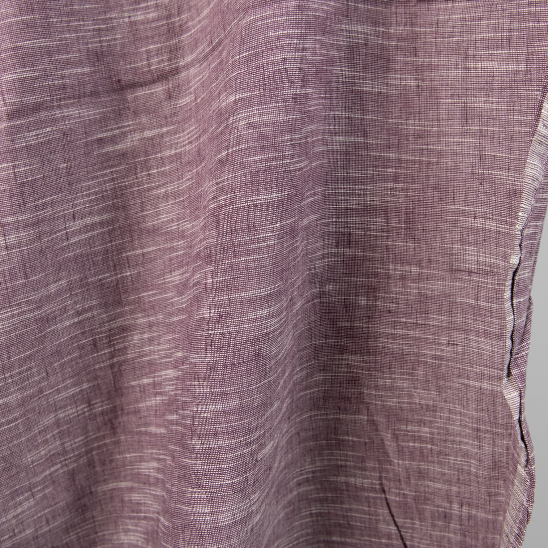Tkanina melanżowa wytkana z fioletowej o czerwonym odcieniu przędzy lnianej oraz bawełnianej. Do ożywienia tkaniny użyliśmy białej przędzy o niejednorodnej grubości – wytkaliśmy tkaninę w poprzeczne, nieregularne prążki. Lekka, gęsta tkanina została poddana praniu, jest miękka, po kolejnych praniach się nie ściągnie.