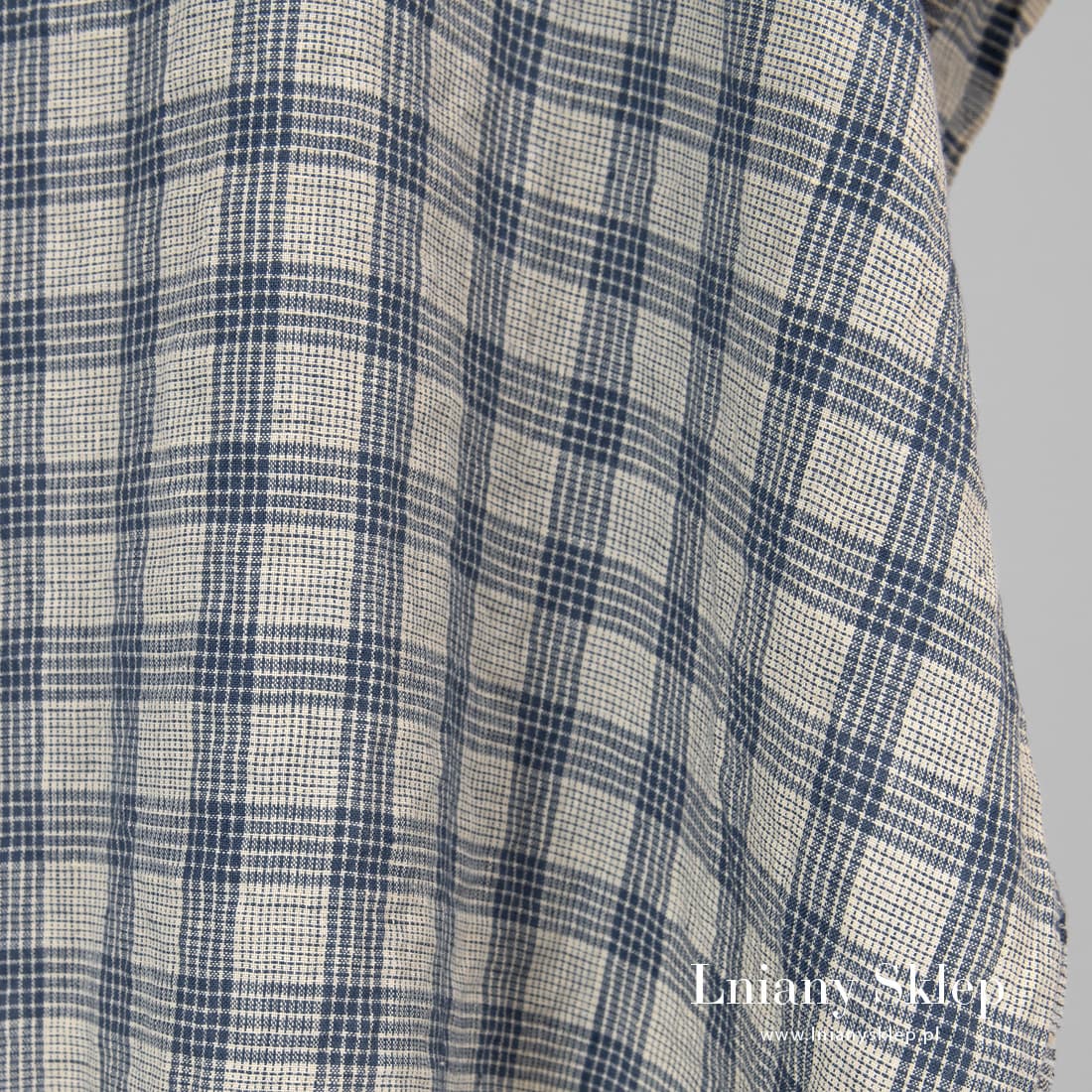• Żółtawy w granatową kratkę prany len.