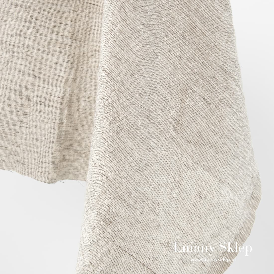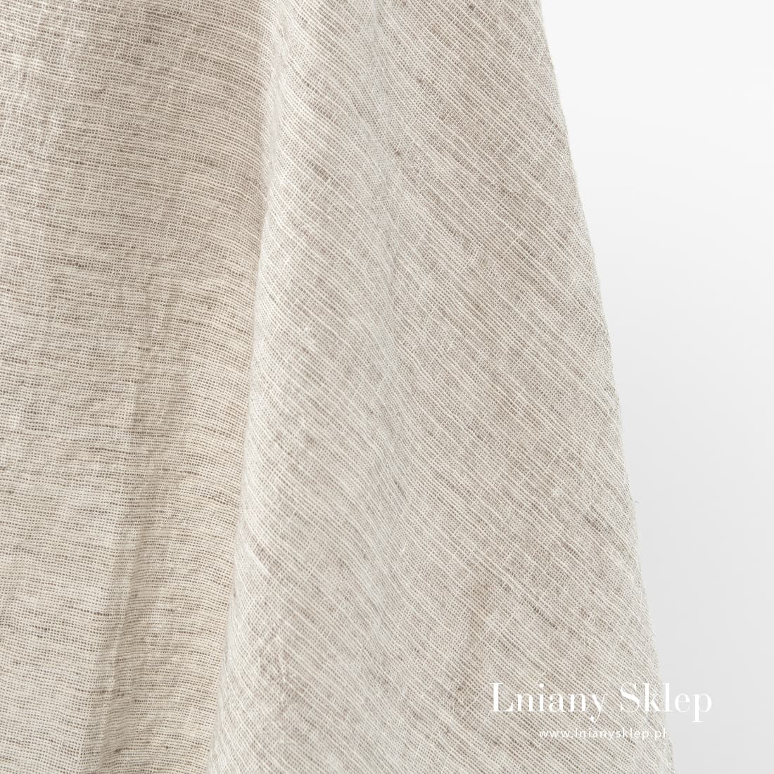 Szeroka piaskowa prana tkanina len z bawełną została wytkana z przędzy białej bawełnianej i piaskowej lnianej. Zgrubienia na odcinkach przędzy ożywiają gładkie tło tkaniny, układając się w nieregularne, grubsze paski. Po praniu tkanina jest miękka i przytulna. Szerokość 275 cm!