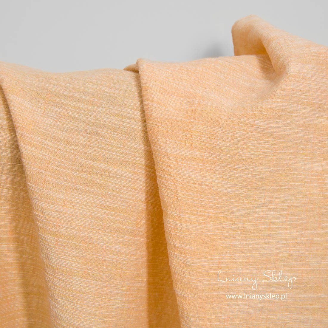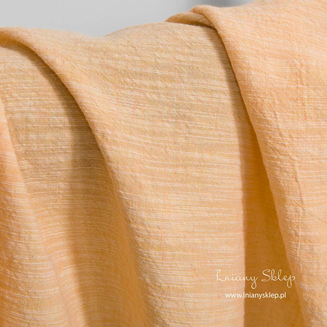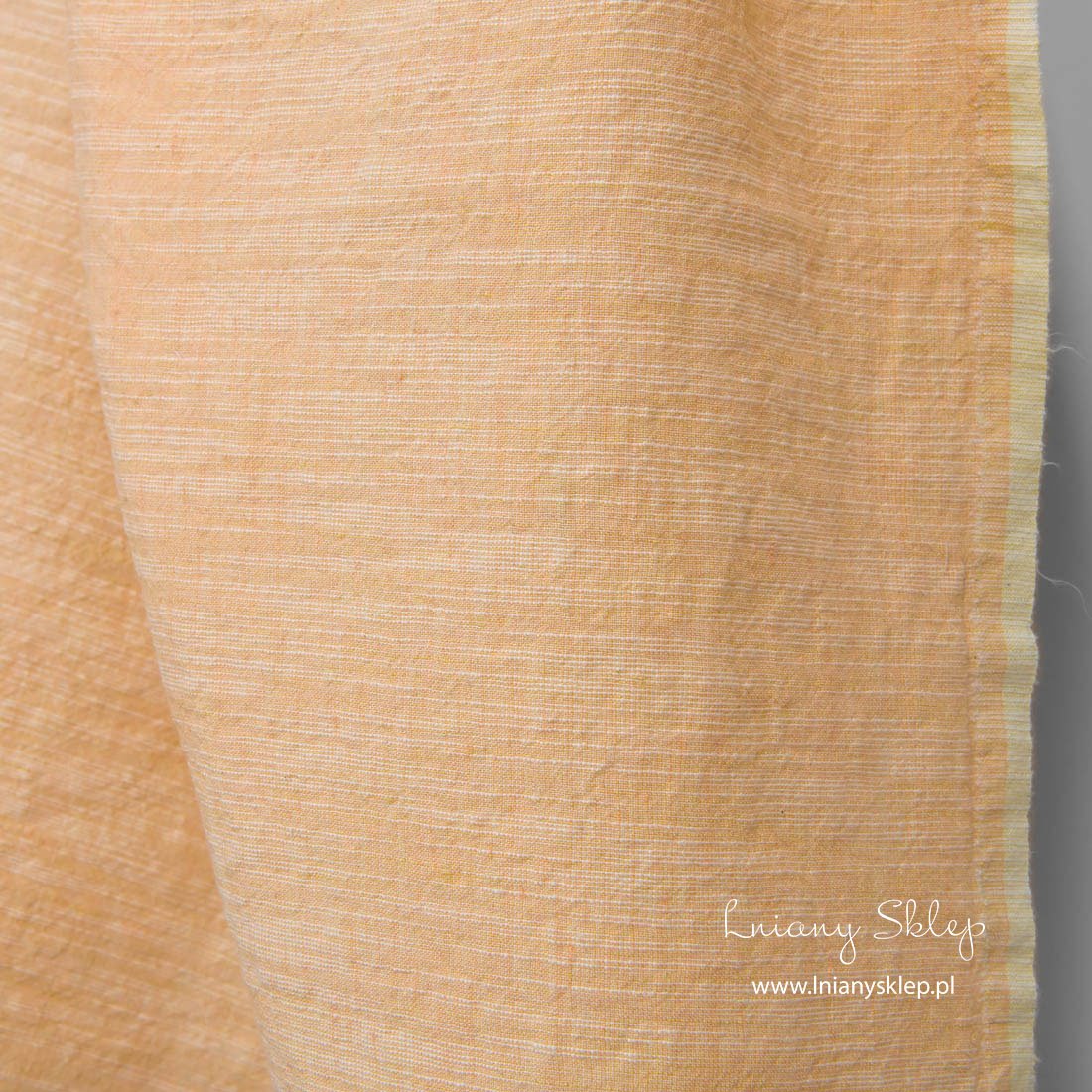 Szeroka, prana tkanina lniano – bawełniana brzoskwiniowa wytkana została w poziomo biegnące nieregularne białe paski. Mocna, gęsta, średnio ciężka tkanina. Poddana praniu tkanina już się nie ściągnie, ma lekko gniecioną fakturę.