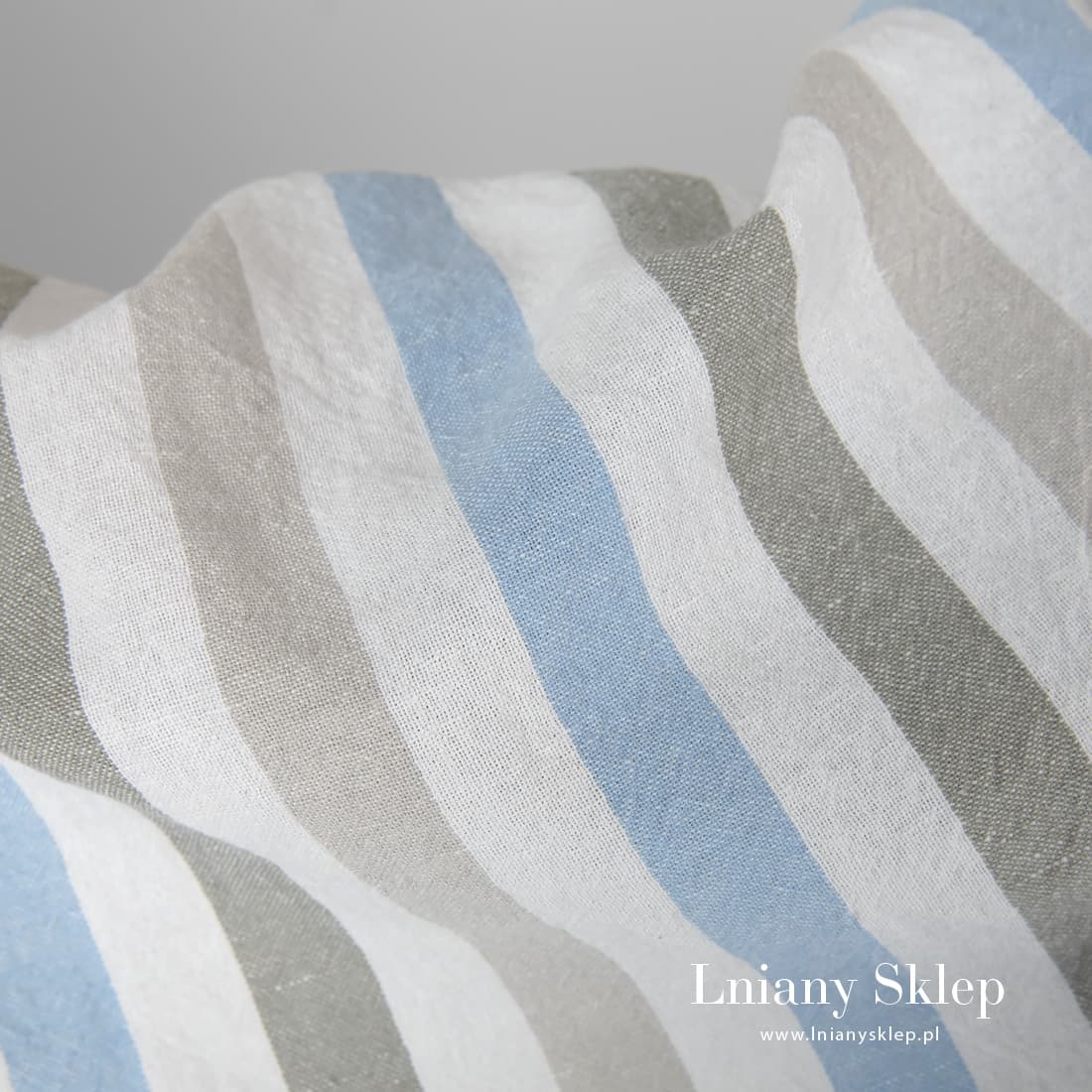 Szeroka prana tkanina w paski szare i niebieskie wytkane pionowo z przędzy białej, zielonkawej, piaskoweji niebieskiej. Tkanina po praniu miękka i nie ściagnie się więcej. Tkanina szeroka, dlatego pasuje na szycie dużych produktów: zasłon, pościeli, obrusów.