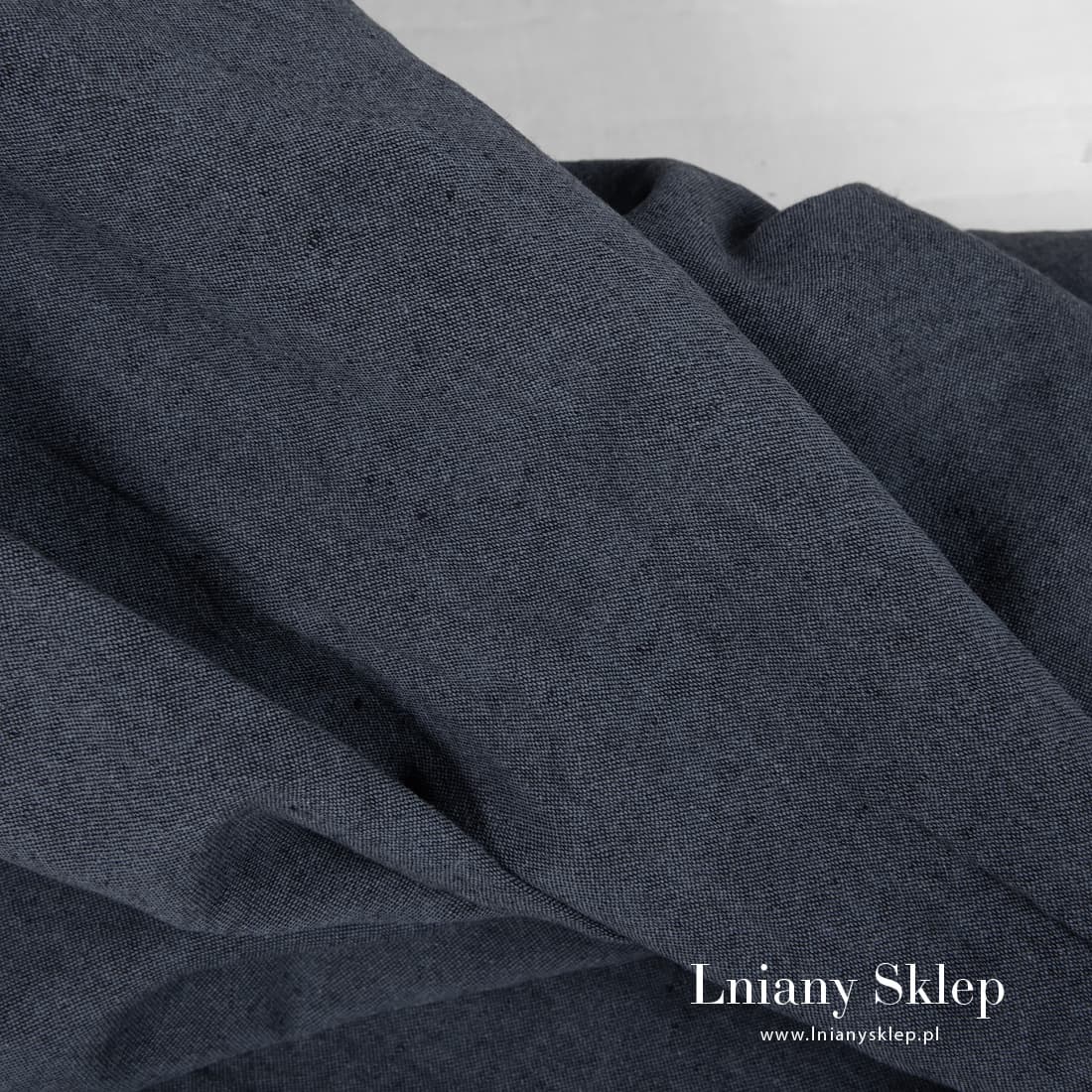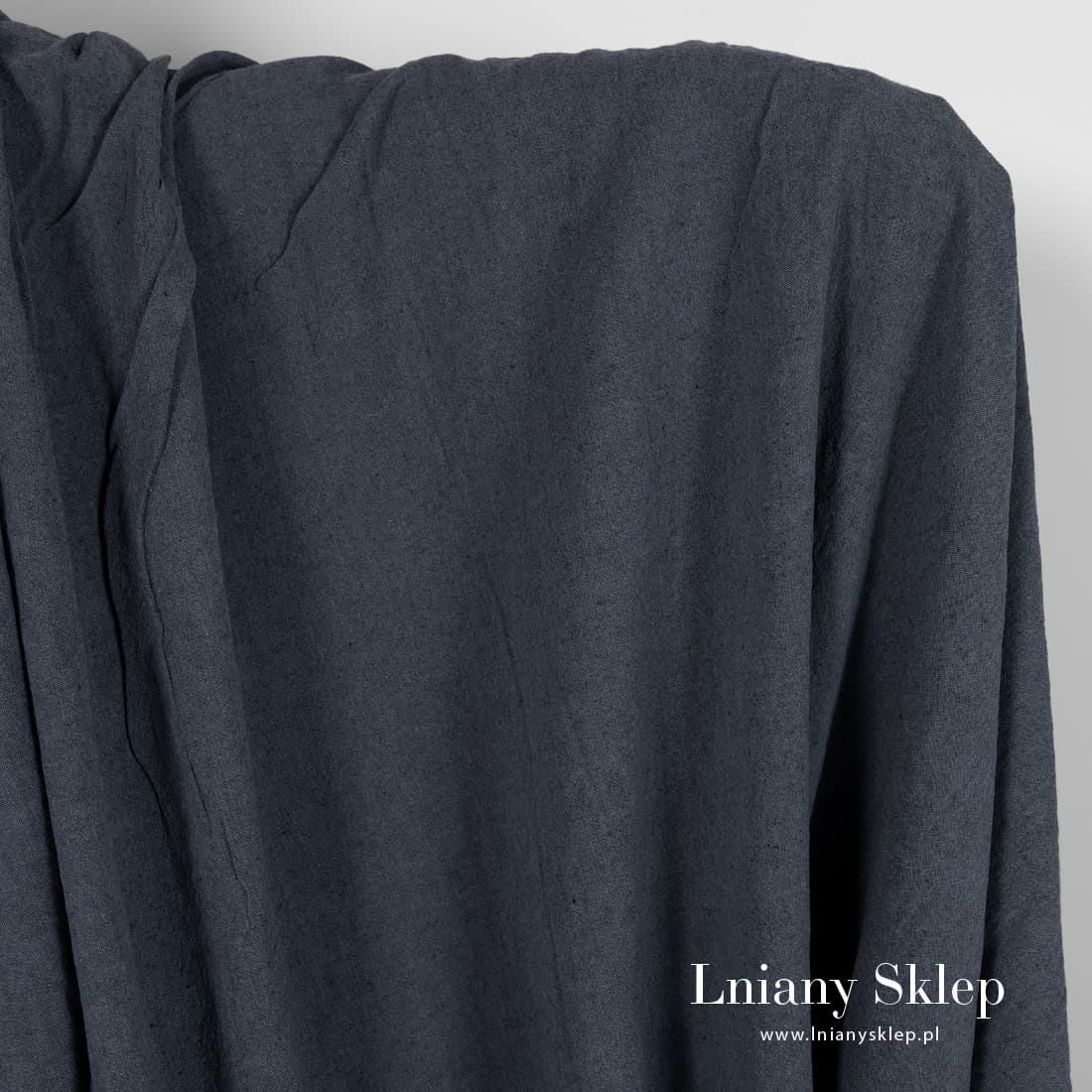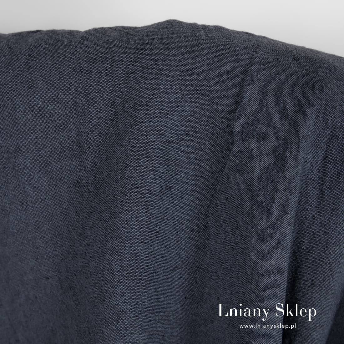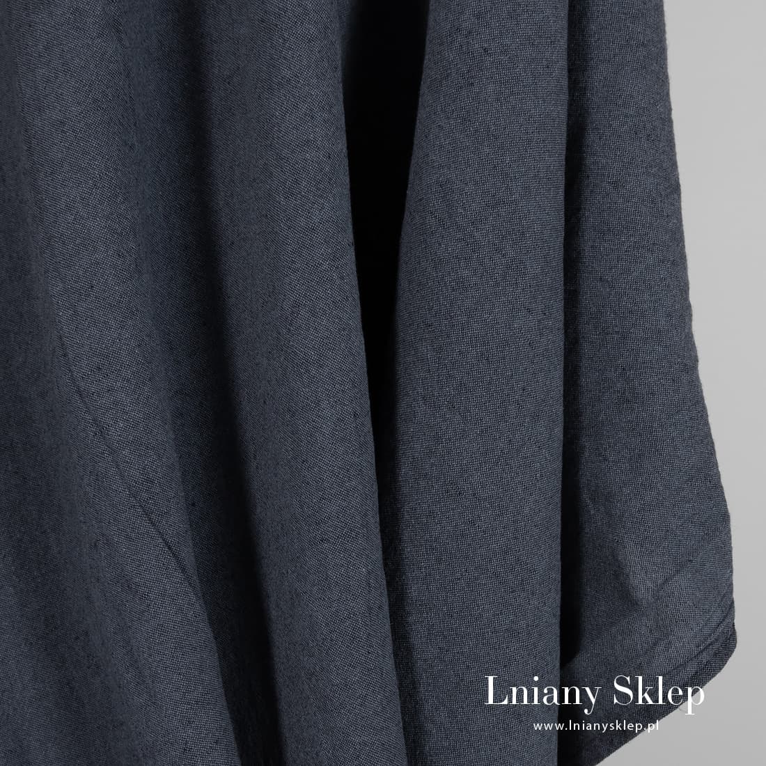 Szeroki granatowy prany len o szarym odcieniu. Wytkany melanżowo z przędzy lnianej 100% granatowej o szarym odcieniu i czarnej. Po praniu mięciutki i przyjemny w dotyku. Szerokość tkaniny pozwala szyć z niej duże produkty bez dodatkowych szwów.