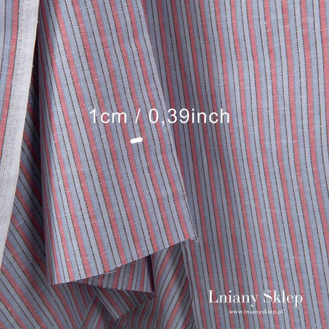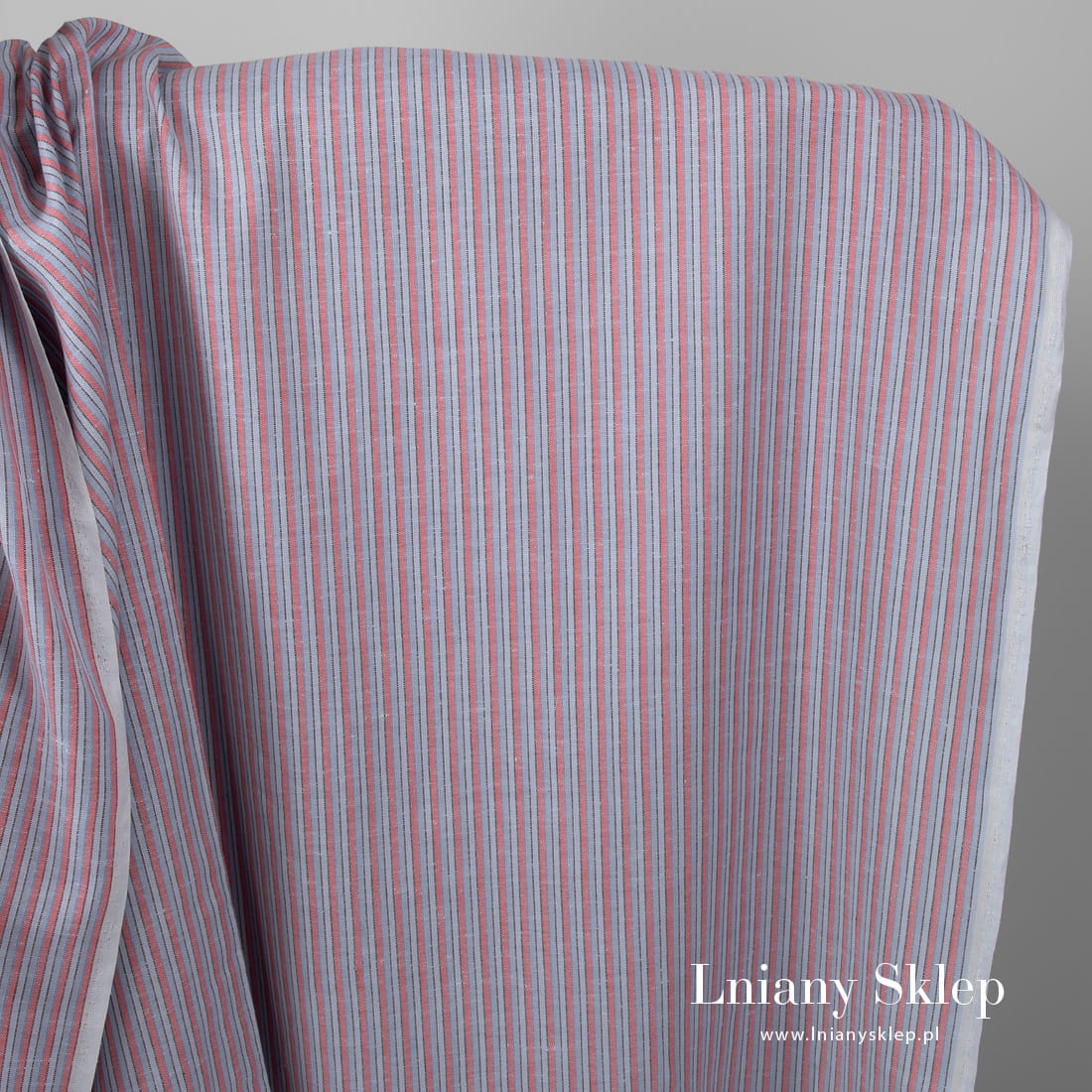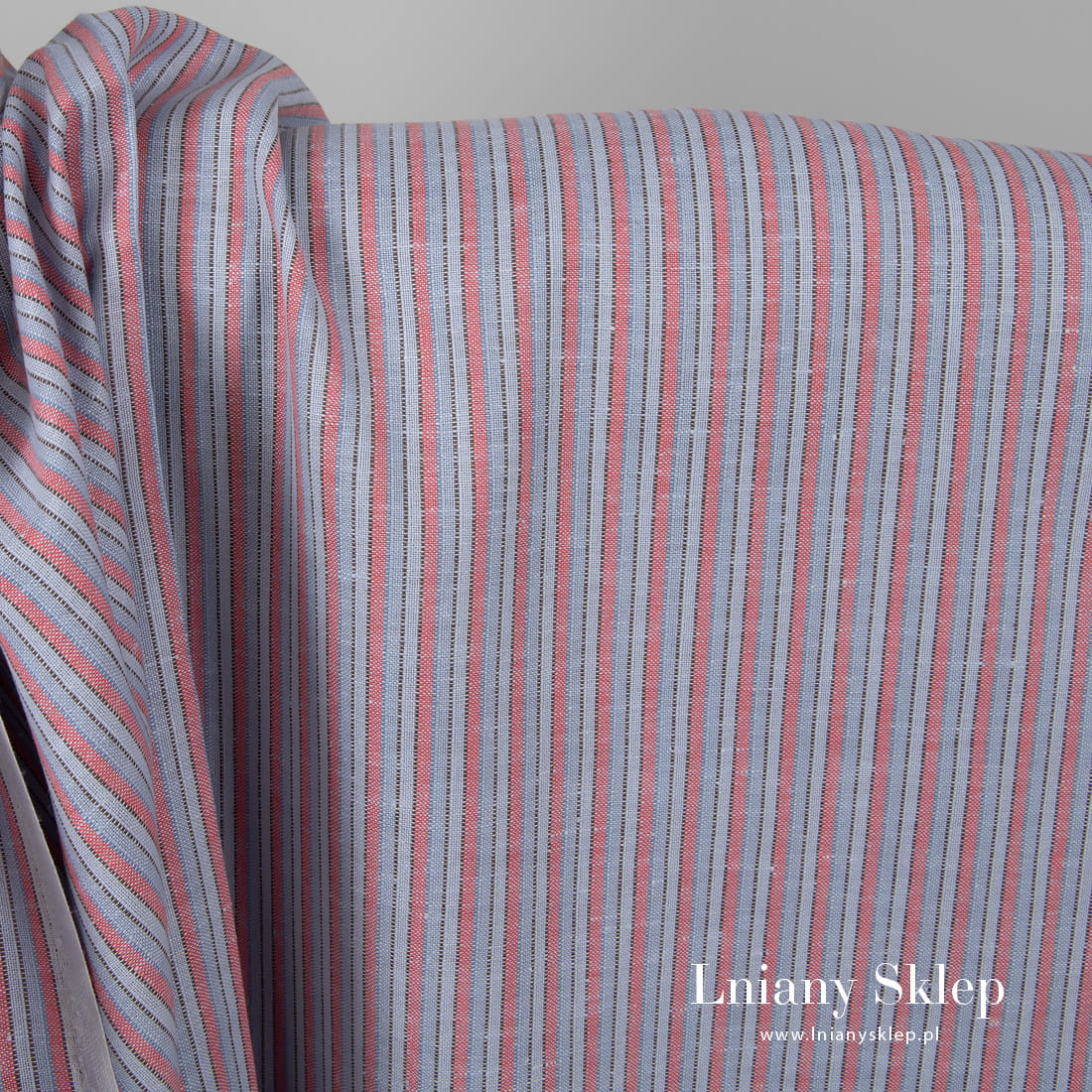 Tkanina w różowe i niebieskie paski wytkane pionowo z przędzy szarej, brązowej, niebieskiej i różowej. Dość lekka, gęsta tkanina lniano - bawełniana. Dostępna w dwóch szerokościach: 150 cm albo 273 cm.