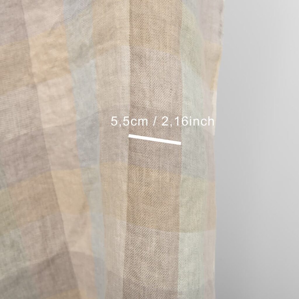 - Kolor: mieszanka przędz w kolorach brązowo-szarym (zbliżonym do naturalnego lnu), szarym dymnym, jasnoszarym lnianym (szaro-brązowym), lodowym szarym, bladoniebiesko-zielonym, jasnym kakao, białego piasku i ciemnego piasku