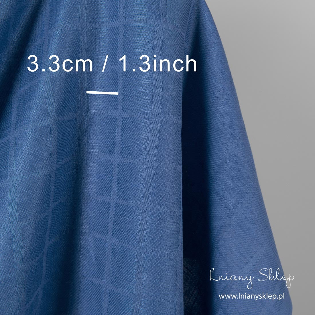 Atramentowa (intensywnie niebieska), żakardowa tkanina lniano - bawełniana wytkana splotem skośnym. Pionowe i poziome paski tworzą wzór kratki o wymiarach 4,2 x 4,5cm. Mocna, gęsto tkana, średnio gruba tkanina na szycie najróżniejszych produktów.