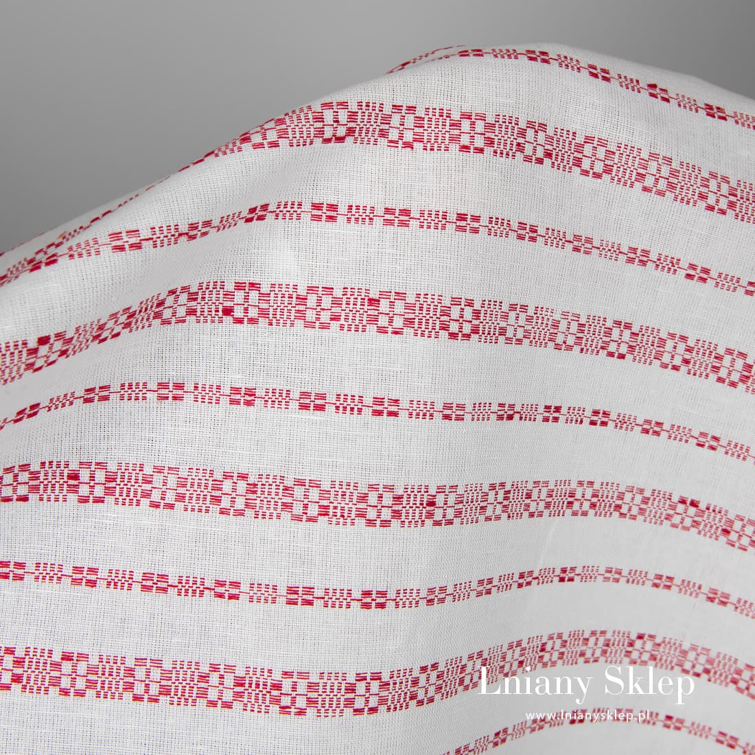 Biała tkanina lniano - bawełniana wytkana w czerwone, poziomo biegnące szlaczki szerokie 0,5 i 1,5 cm. Szerokość białej tkaniny między szlaczkami – 2cm. Mocna, gęsta, średnio ciężka tkanina.