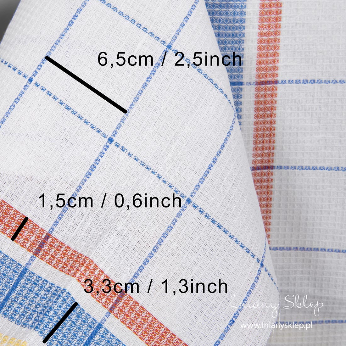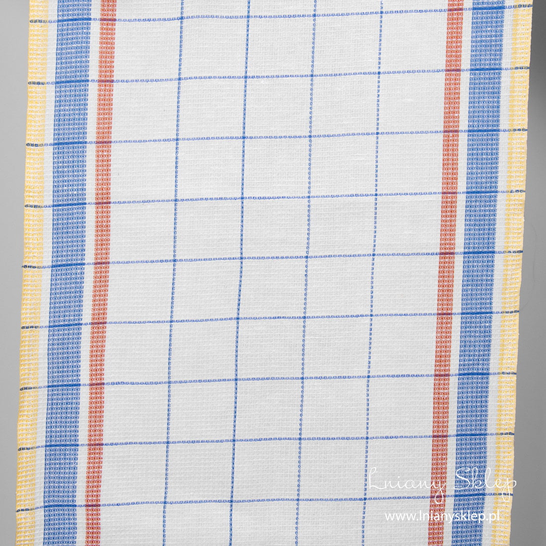 Biała waflowa tkanina ścierkowa w kratkę len z domieszką bawełny. Białe tło zdobi niebieska kratka 6,5cm x 6,5cm. Brzegi wytkano w żółte, czerwone i niebieskie pasy. Splot waflowy po pierwszym praniu stanie się wypukły, a sama tkanina nieco się ściągnie. Tkanina na szycie ścierek kuchennych. Szerokość 50 cm.