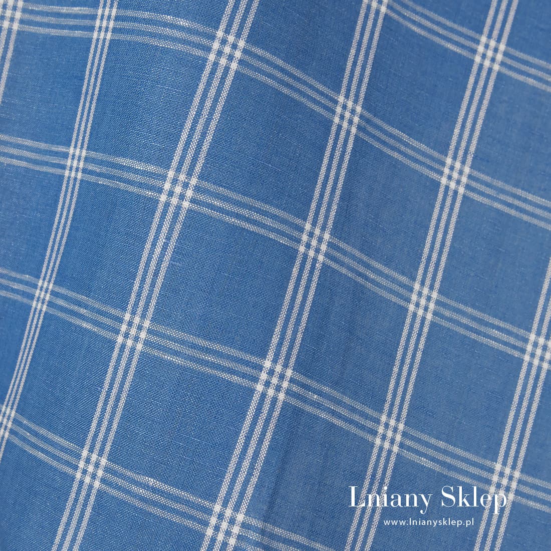 Błękitna tkanina w białą kratkę len z bawełną. Mocna, gęsta, średnio ciężka tkanina na szycie odzieży oraz tekstyliów domowych: pościeli, obrusów, serwetek, fartuchów.