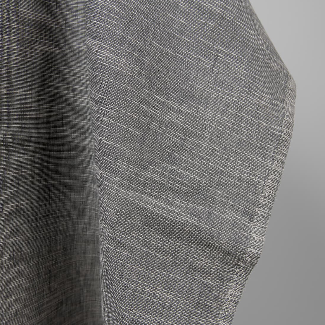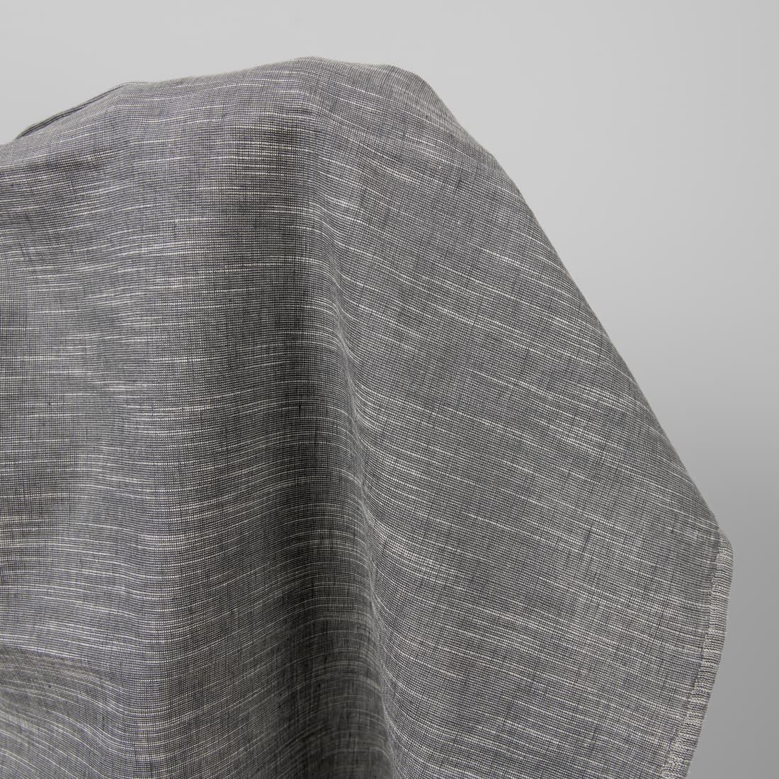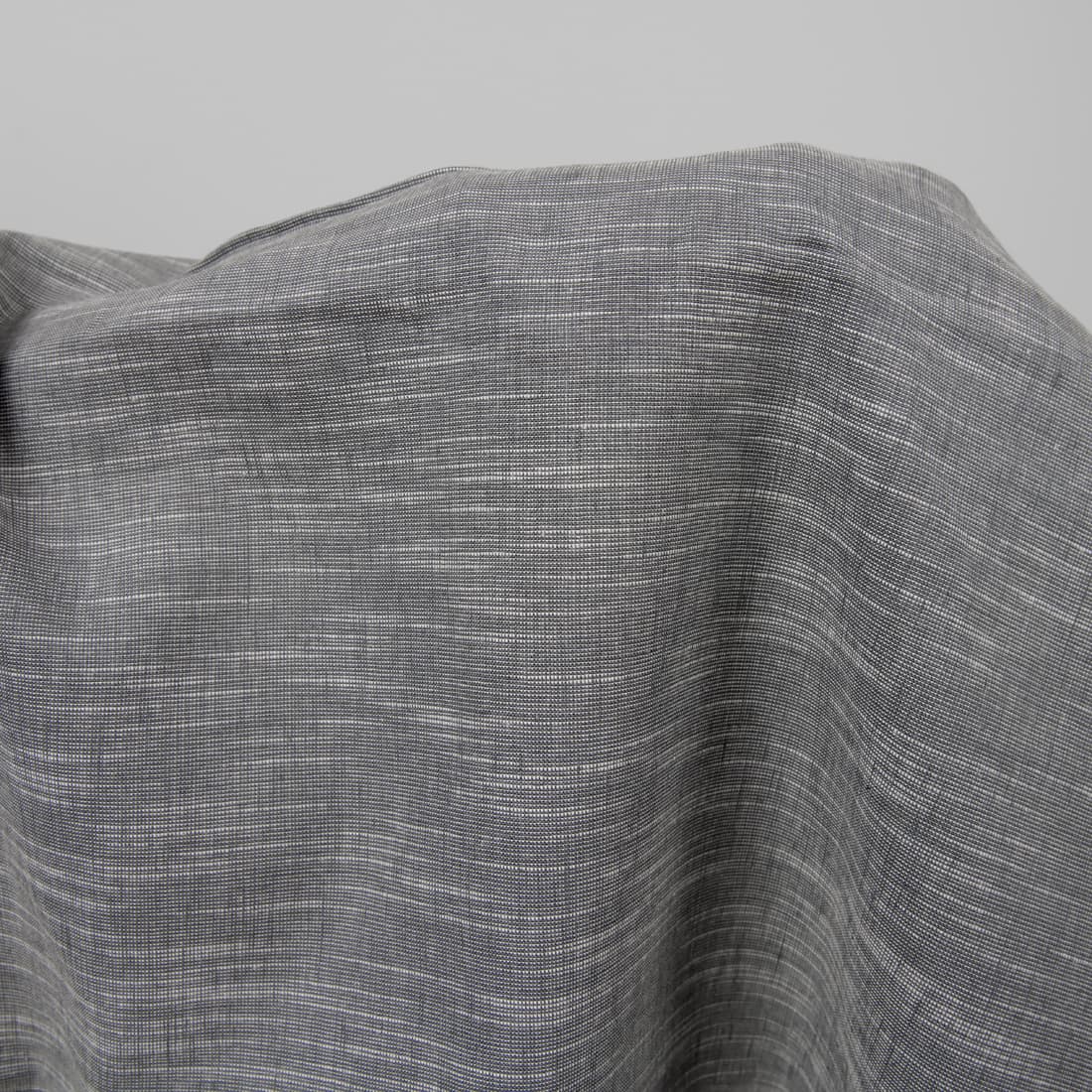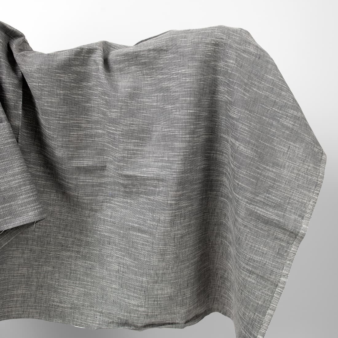 Melanżowa tkanina lniano - bawełniana wytkana z gładkiej ciemnoszarej i dekoracyjnej białej przędzy. Biała przędza ma różną grubość, dlatego tkanina po wytkaniu ma rysunek przerywanych białawych pasków. Gęsta i dość lekka tkanina idealnie pasuje na szycie ubrań, akcesoriów, a także tekstyliów domowych: pościeli, zasłon, a także różnych produktów konfekcji stołowej.