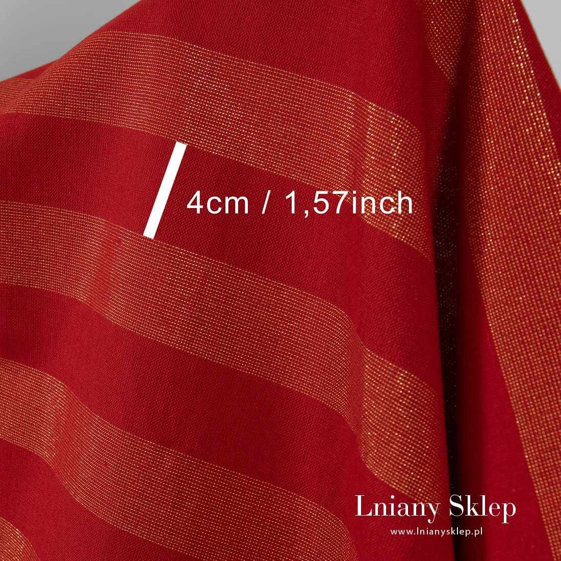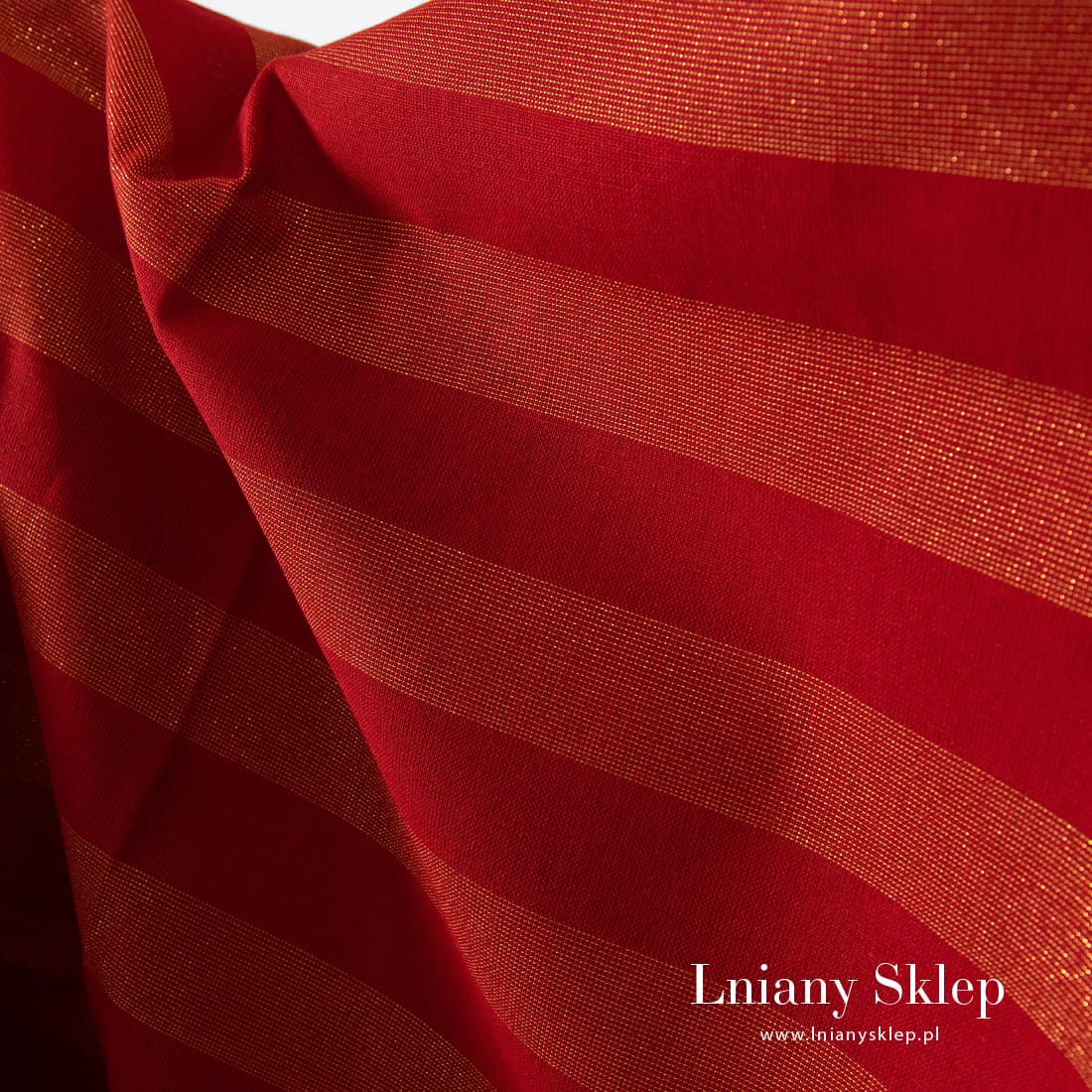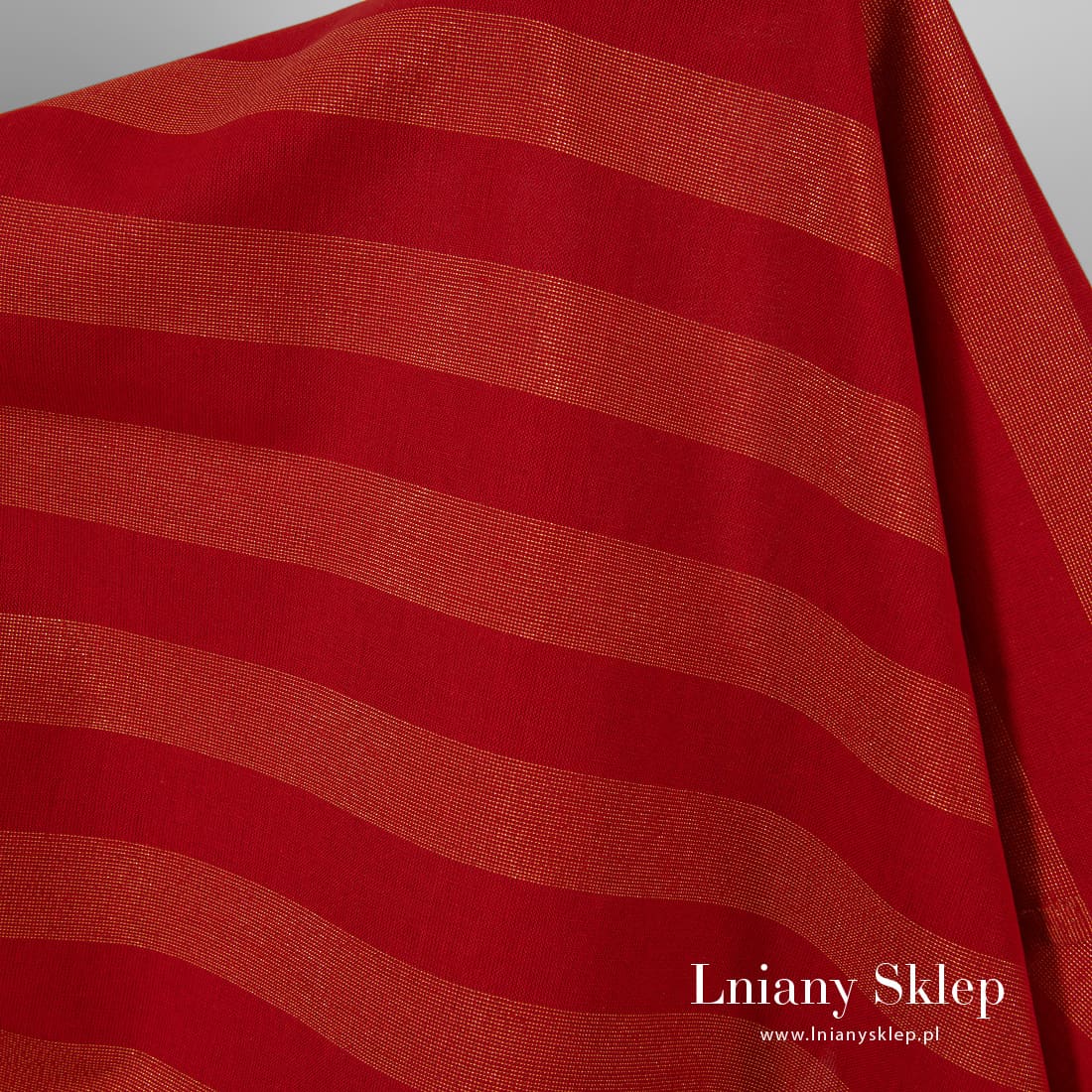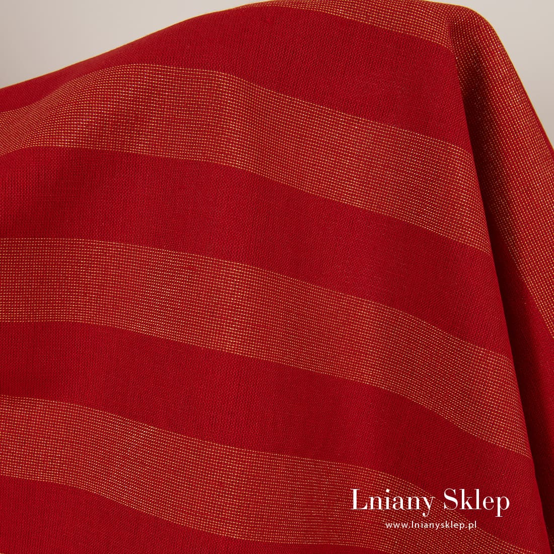 Czerwona tkanina lniano - bawełniana wytkana w poziome, złociście połyskujące pasy szerokie 4cm. Gęsto tkana, mocna i wytrzymała, stylowa i elegancka tkanina na szycie odświętnych ubrań albo produktów konfekcji domowej.