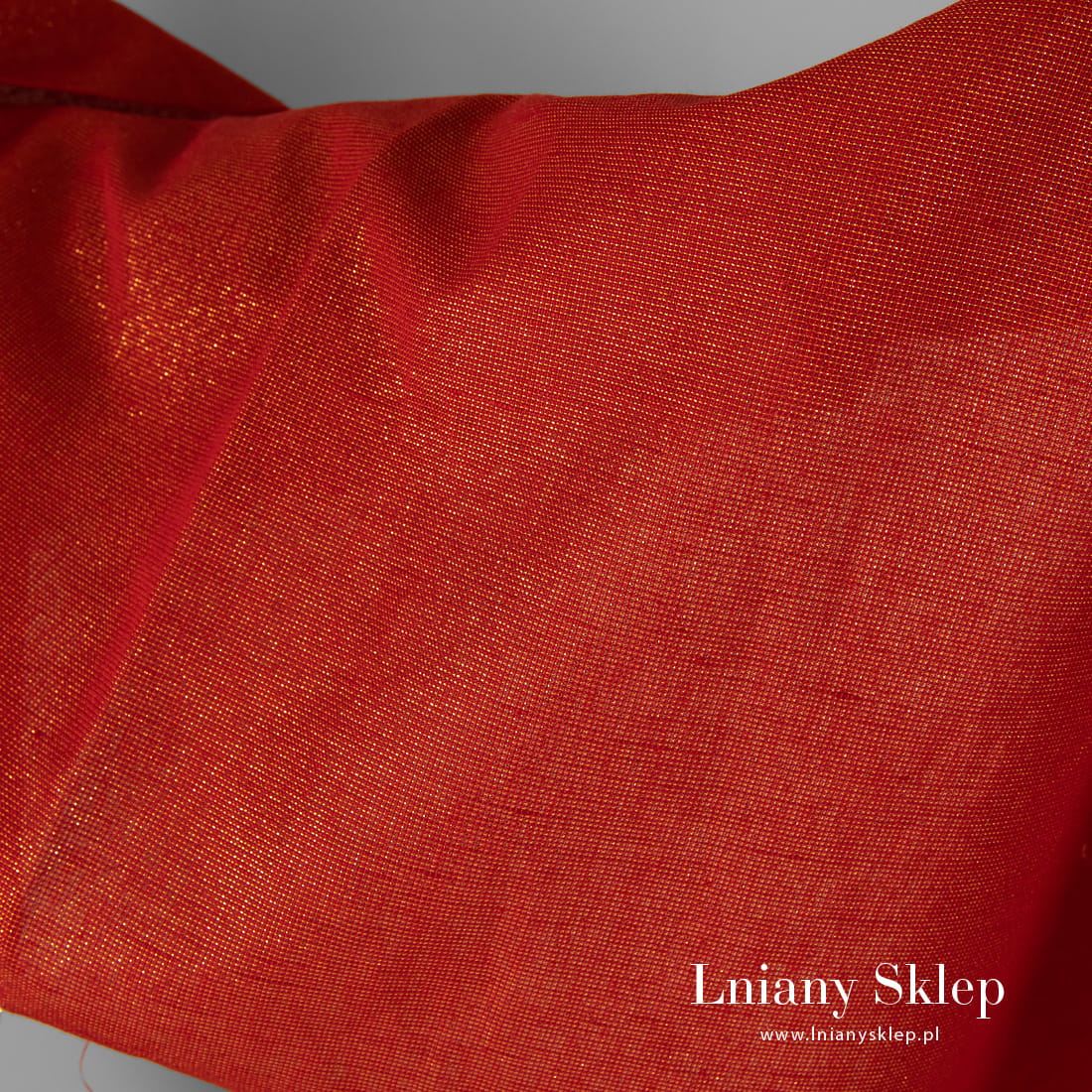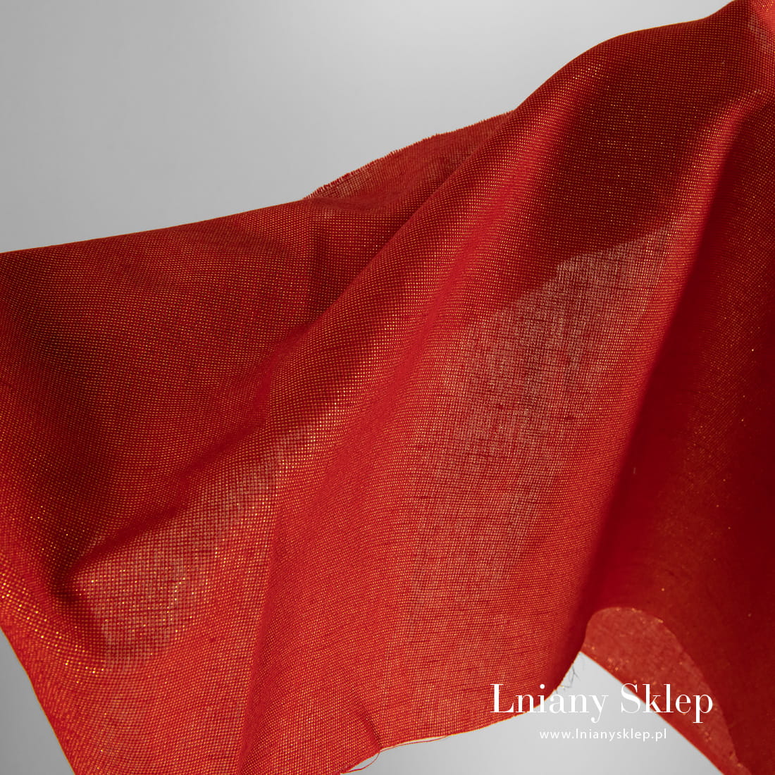 Czerwona tkanina ze złotym połyskiem. Nić z poliestru nadaje tkaninie delikatnego połysku. Tkanina na szycie wykwintnych produktów: akcesoriów, odzieży, zasłon, produktów konfekcji stołowej i in.