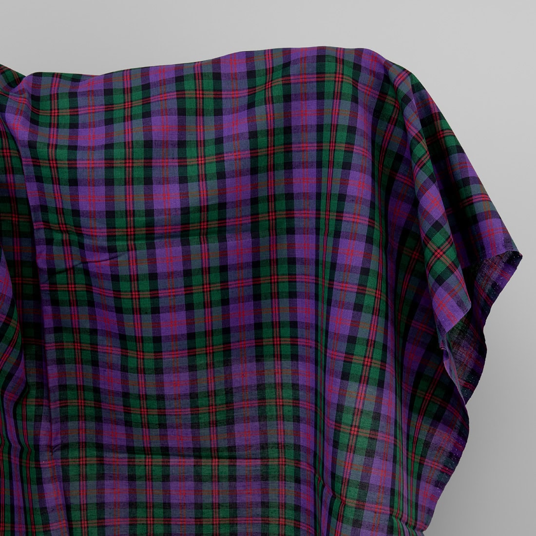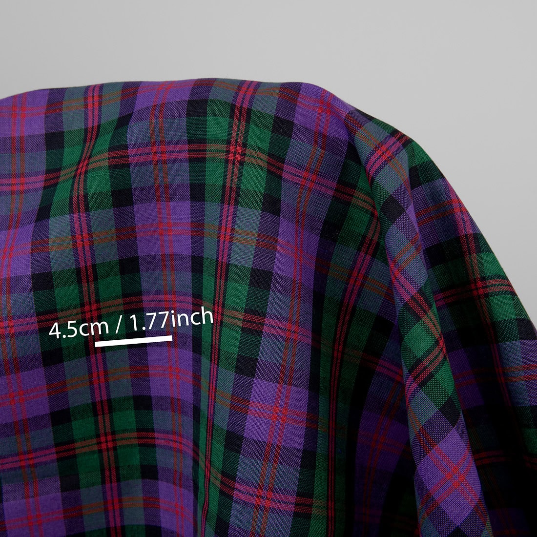 Tkanina wytkana w jaskrawą szkocką fioletowo-zielono-czerwono-czarną kratkę. Lniano-bawełniana tkanina jest gęsta, średnio ciężka. Jaskrawa klasyczna tkanina-dobry wybór na szycie wielu tekstyliów domowych.