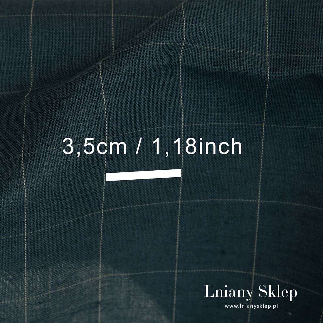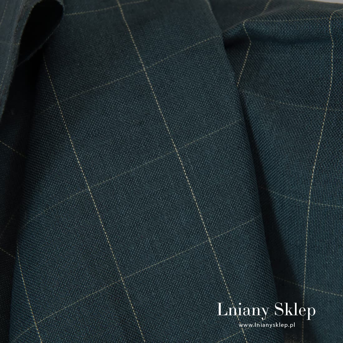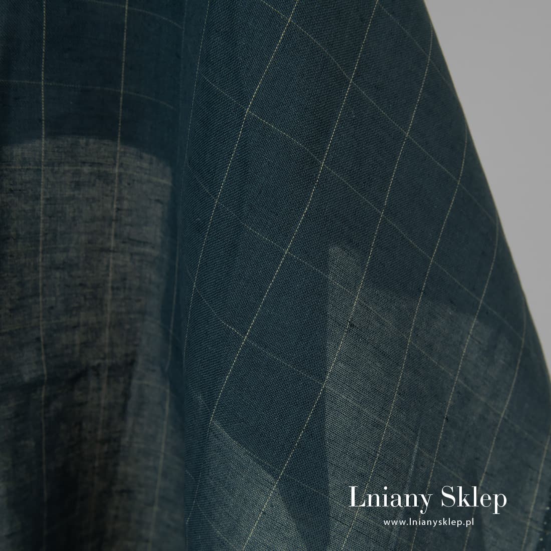 Granatowa w szarą kratkę tkanina len z bawełną. Granatowe o lekkim szarym odcieniu tło wytkane w cieniutką kratkę z przerywanej kreski z przędzy szarej o lekkim zielonym odcieniu. Tkanina lekka, gęsta, lekko prześwitująca.
