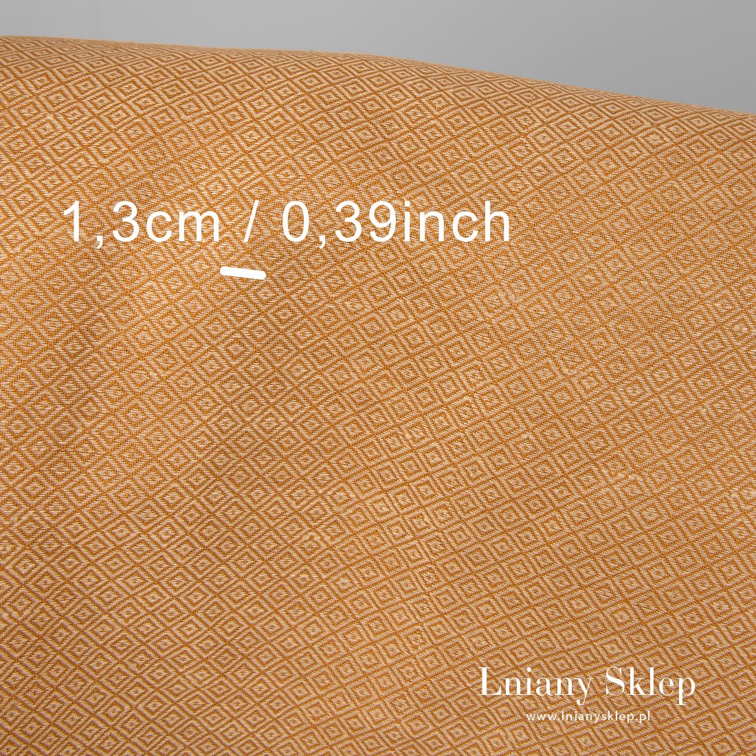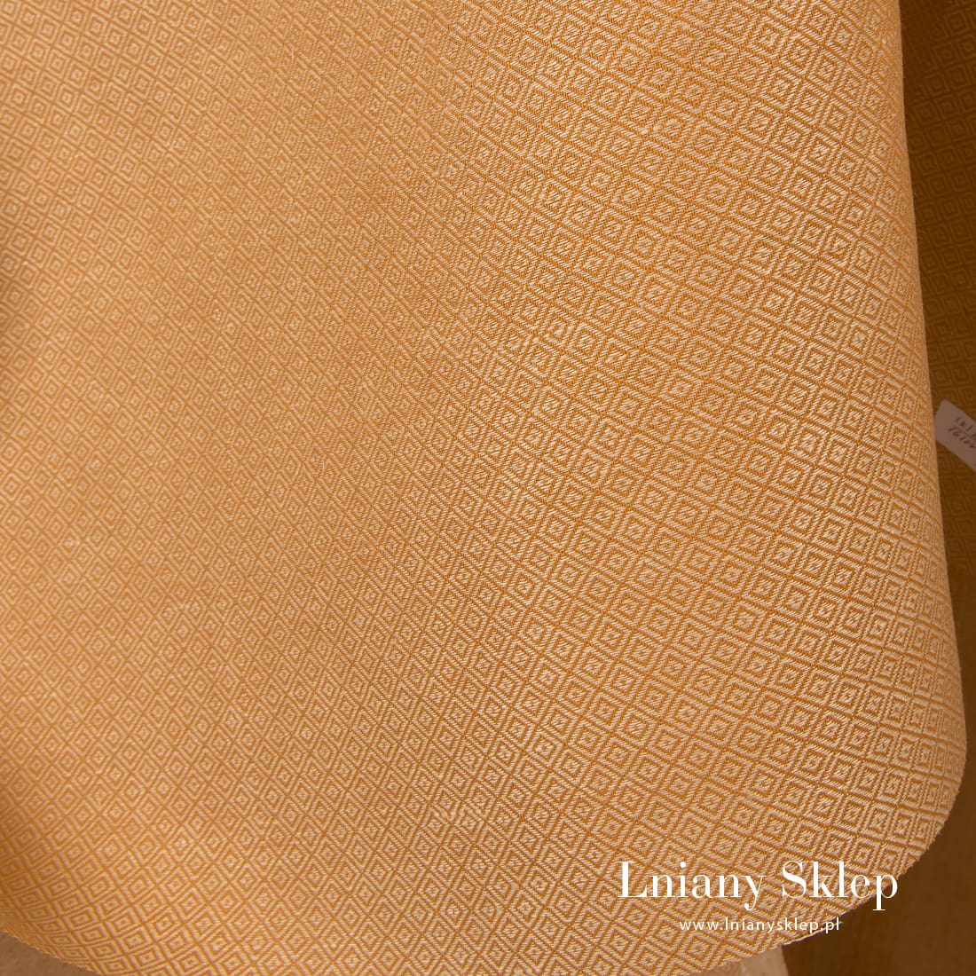 Jasny pomarańczowy len z domieszką bawełny. Tkanina wytkana z jasnoszarej i jasnobrązowej (karmel) przędzy lnianej oraz bawełnianej we rysunek rombów. Brzegi tkaniny zdobią ciemniejsze pasy z gęściej wytkanych, drobniutkich rombów. Te pasy mogą ozdobić rękaw albo brzeg obrusa. Mocna, gęsta, średnio gruba tkanina.