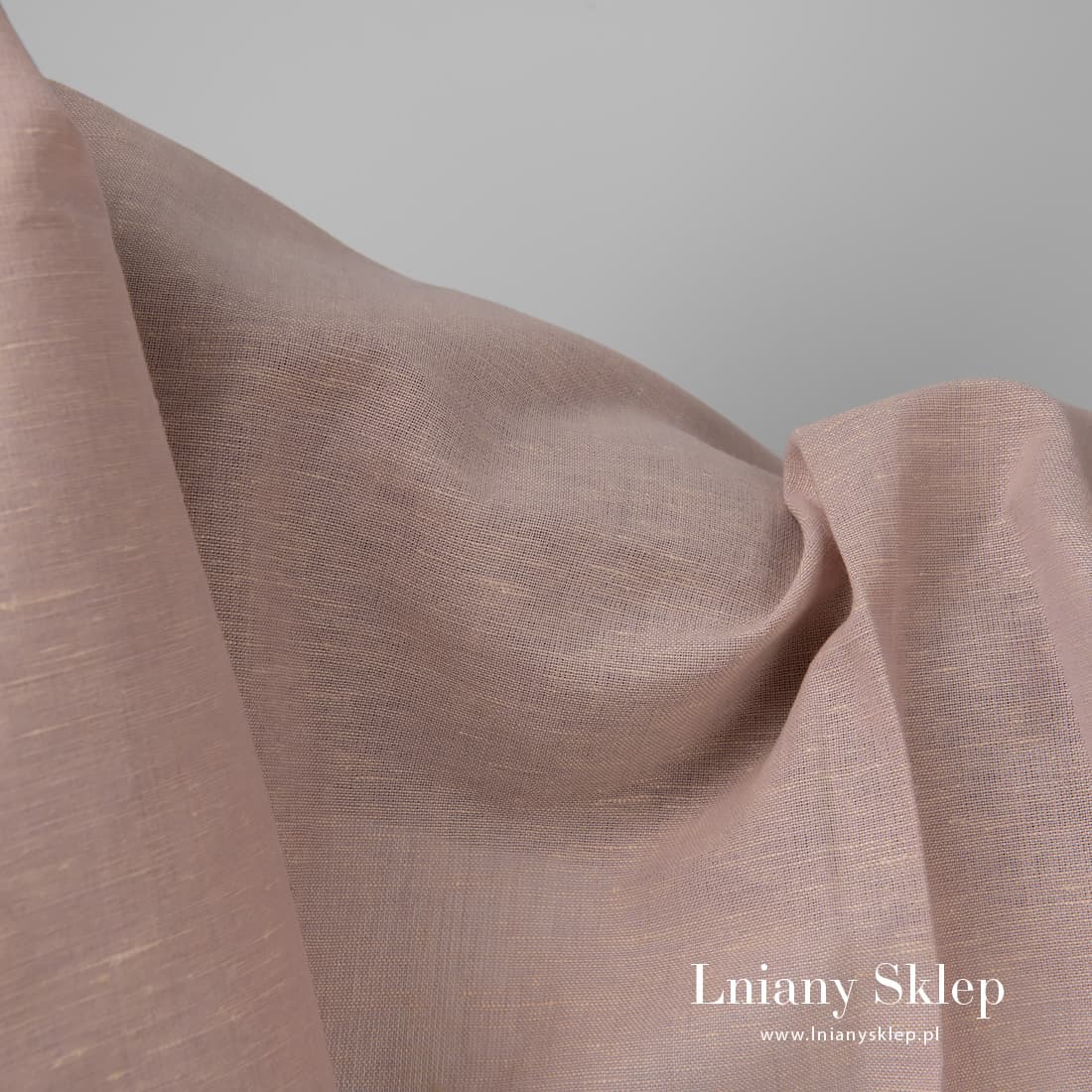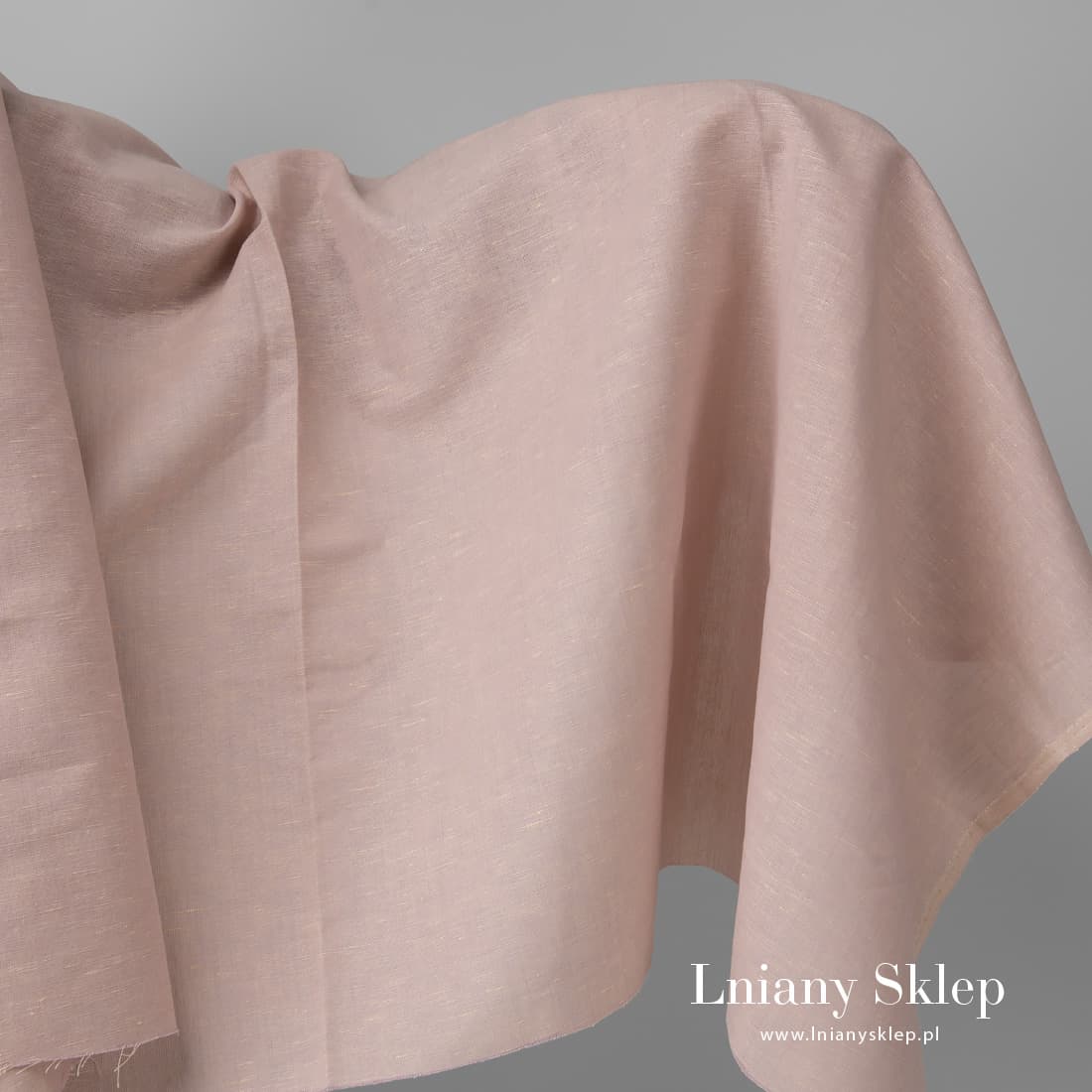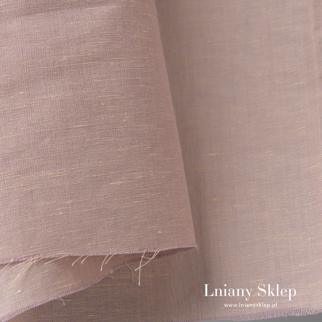 Melanżowa tkanina lniano - bawełniana o lekkim liliowym odcieniu została wytkana z przędzy piaskowej oraz jasnoliliowej. Mocna, gęsta, średnio ciężka tkanina na szycie ubrań i różnych produktów tekstyliów domowych.