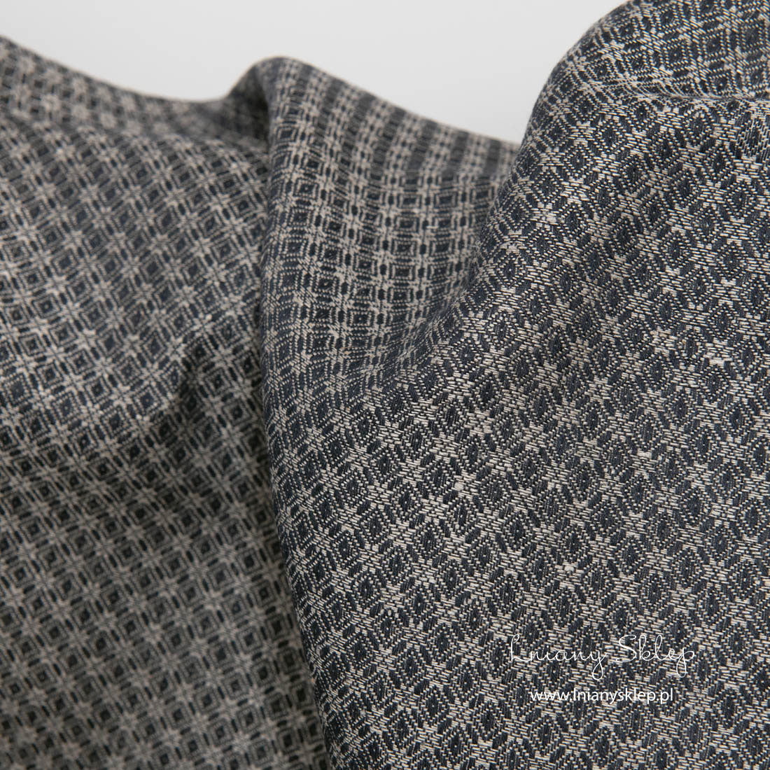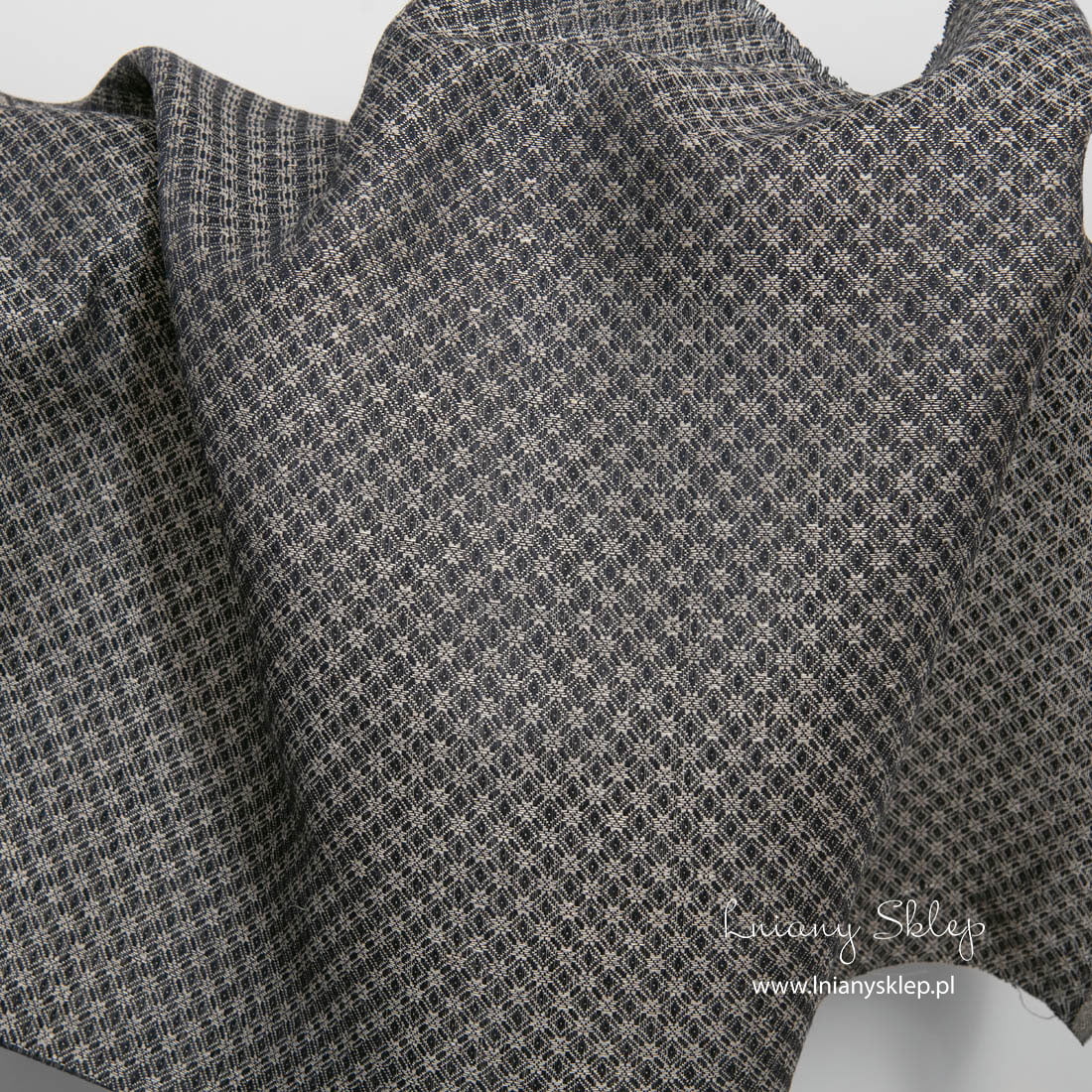 Lniano - bawełniana tkanina ciemna w drobny rzucik wytkana jest z przędzy czarnej bawełnianej i lnianej niebarwionej szarej (lekko piaskowej) w drobny wzór geometryczny: romby i kwiatki. Jest to mocna, średnio ciężka tkanina. Na szycie wielu produktów.