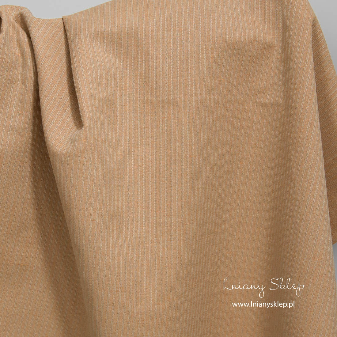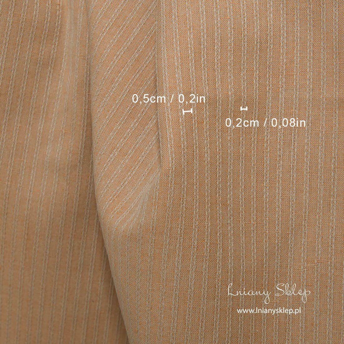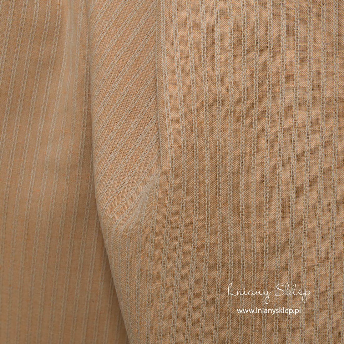 Lniano – bawełniana tkanina karmel w paski wytkana z przędzy jasnoszarej (przypomina niebarwiony len) i jasnobrązowej (karmel). Pionowo wytkana w dekoracyjne paski. Mocna, gęsta, wytrzymała tkanina.