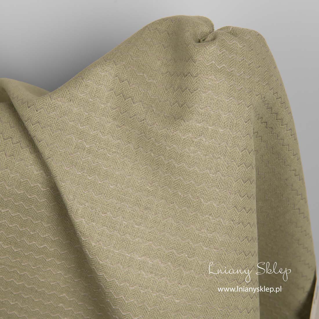 Lniano - bawełniana tkanina zielona we wzór fali wytkanej z niebarwionej (szarej o piaskowym odcieniu) przędzy lnianej. Mocna, gęsta, średnio ciężka, ozdobnie wytkana w drobny, sympatyczny rzucik tkanina.
