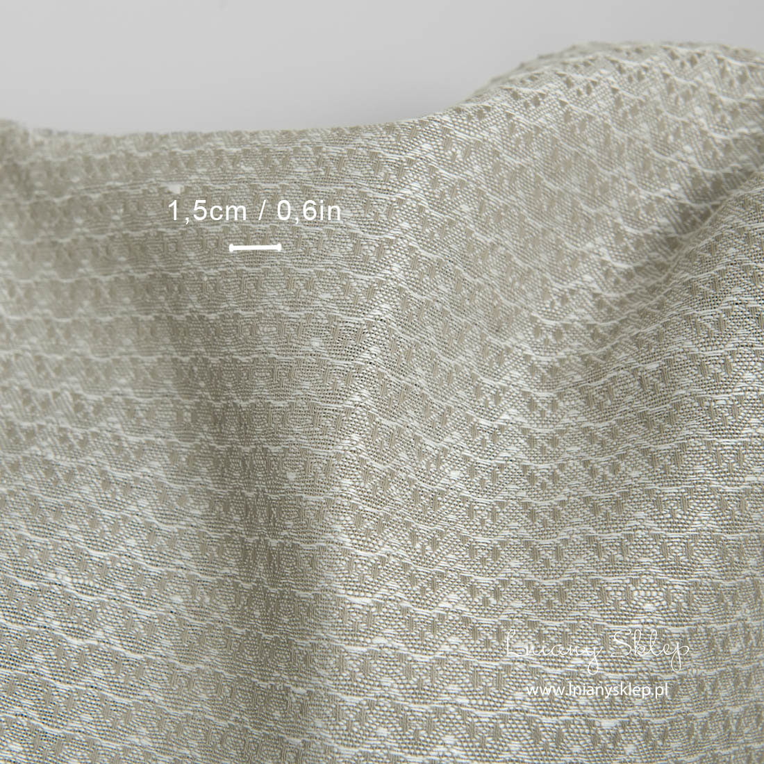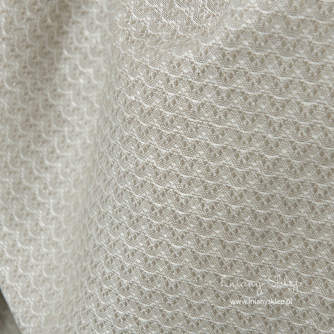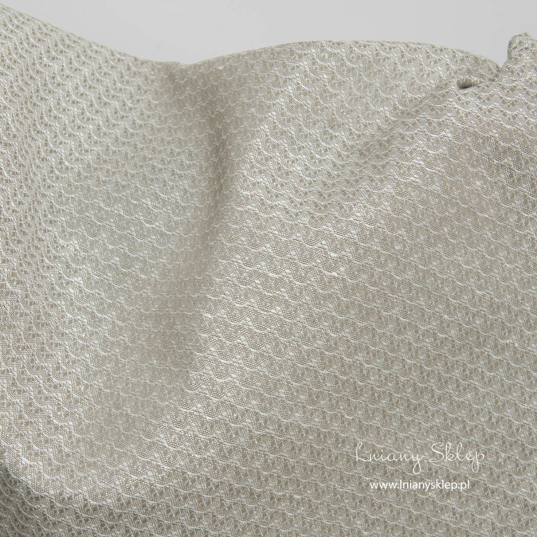 Lniano bawełniana tkanina w finezyjne fale jest wytkana z szarej bawełnianej i mlecznobiałej lnianej przędzy. Jest to gęsta, średnio gruba, mocna i wytrzymała tkanina. Tkanina z włókien naturalnych wytkany w delikatny, wymyślny wzór.