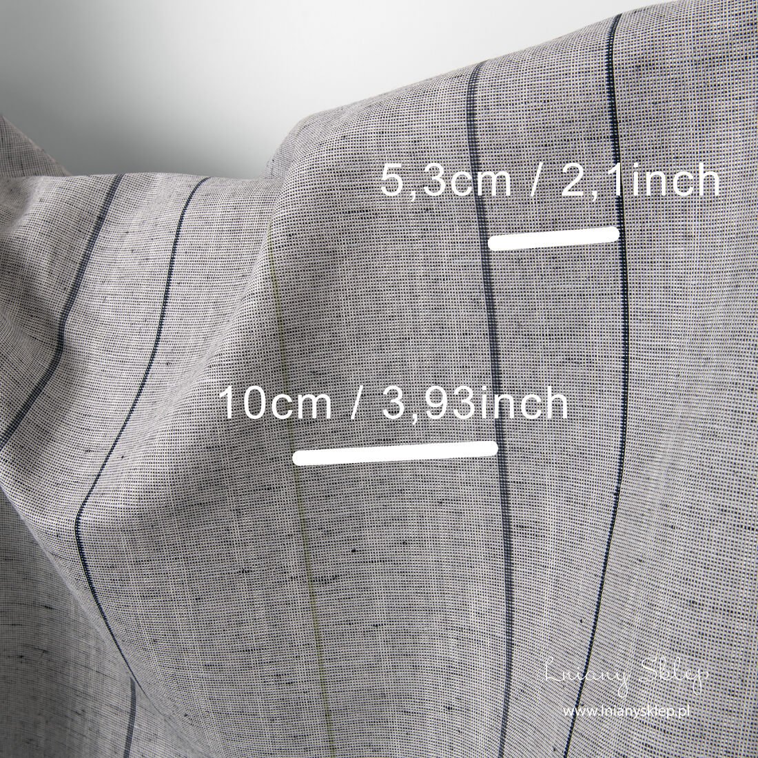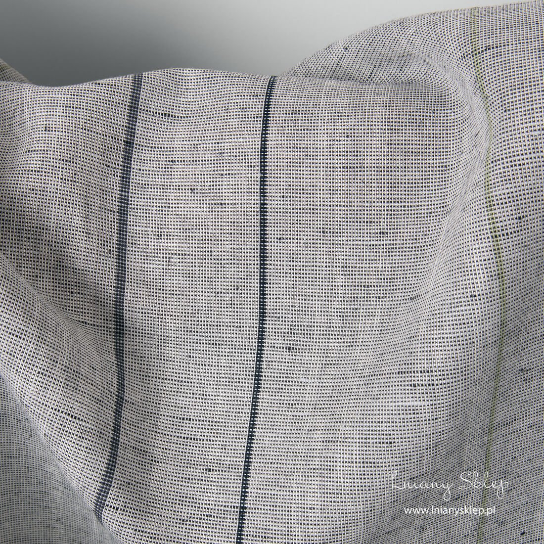 Melanżowy szary w paski len z domieszką bawełny. Melanżowe tło wytkaliśmy z jasnoszarej i czarnej przędzy. Pionowe paski są czarne, białe i zielonkawe. Tkanina mocna, gęsta, średnio ciężka. Tkanina odzieżowa, pasuje też na szycie tekstyliów domowych.