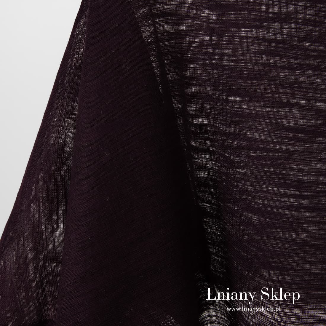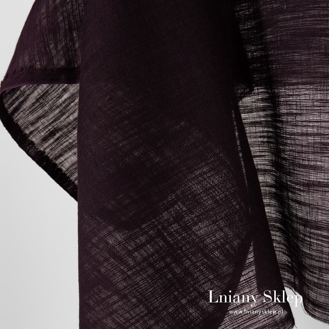 Przeźroczysta tkanina ciemny fiolet w prążki – zgrubienia ułożone poziomo w porządku przypadkowym. Tkanina rzadko wytkana, mocno prześwitrująca, lekka na szycie firanek, szaliczków.