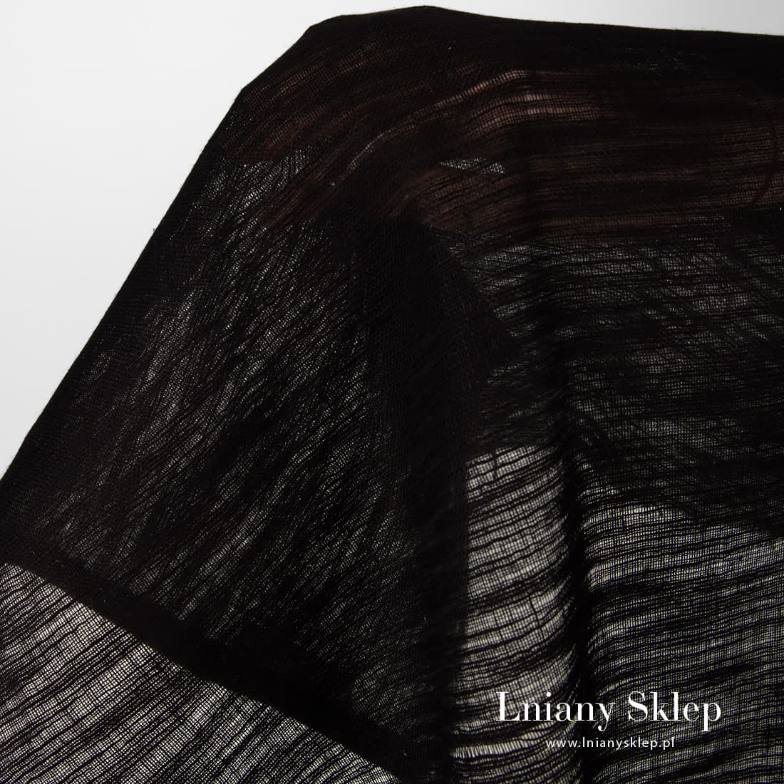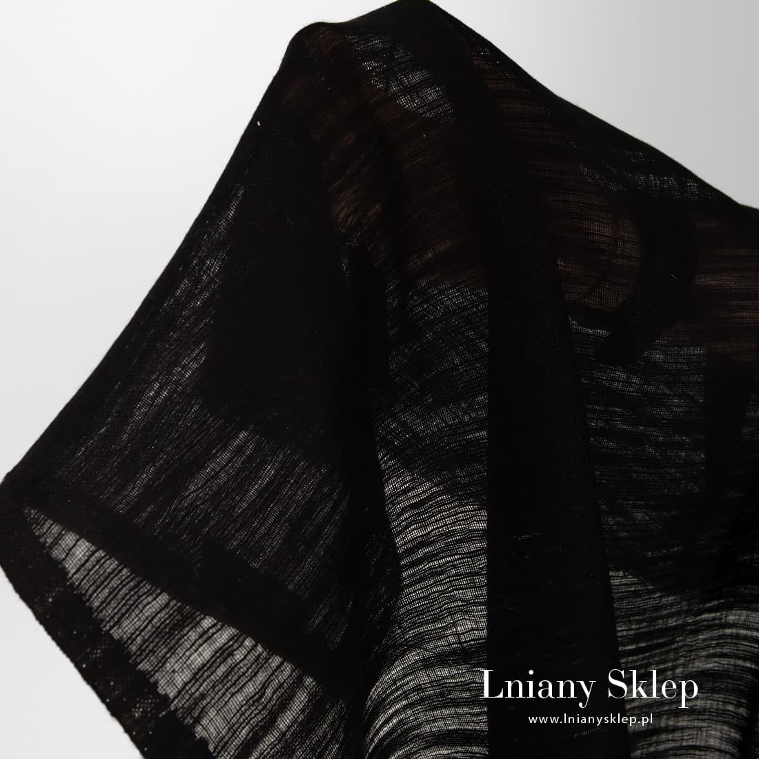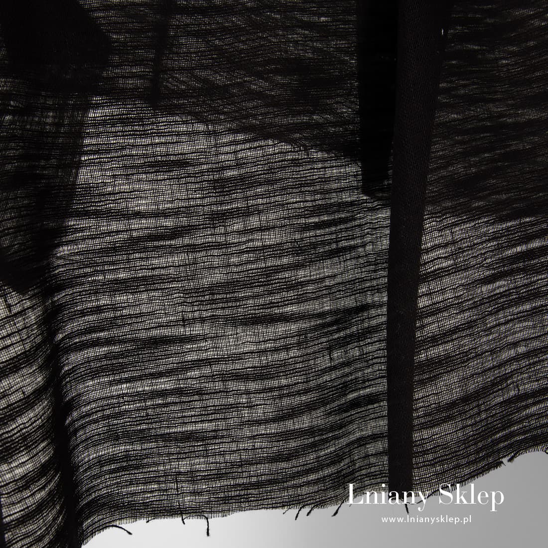Przeźroczysta tkanina czarna w prążki – zgrubienia ułożone poziomo w porządku przypadkowym. Tkanina rzadko wytkana, mocno prześwitrująca, lekka na szycie firanek, szaliczków.