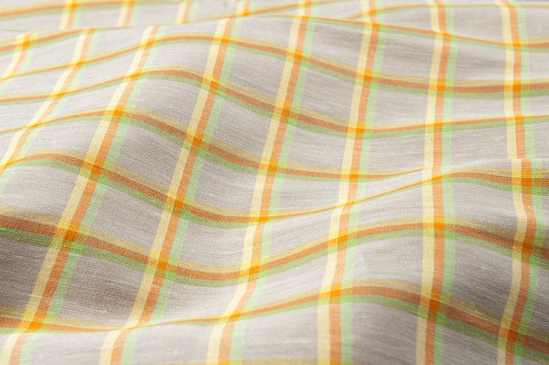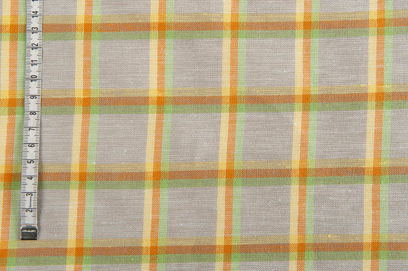Jakościowa, gęsta, lekka i wytrzymała szara tkanina lniano - bawełniana w jasną żółto - pomarańczowo - zieloną kratkę.