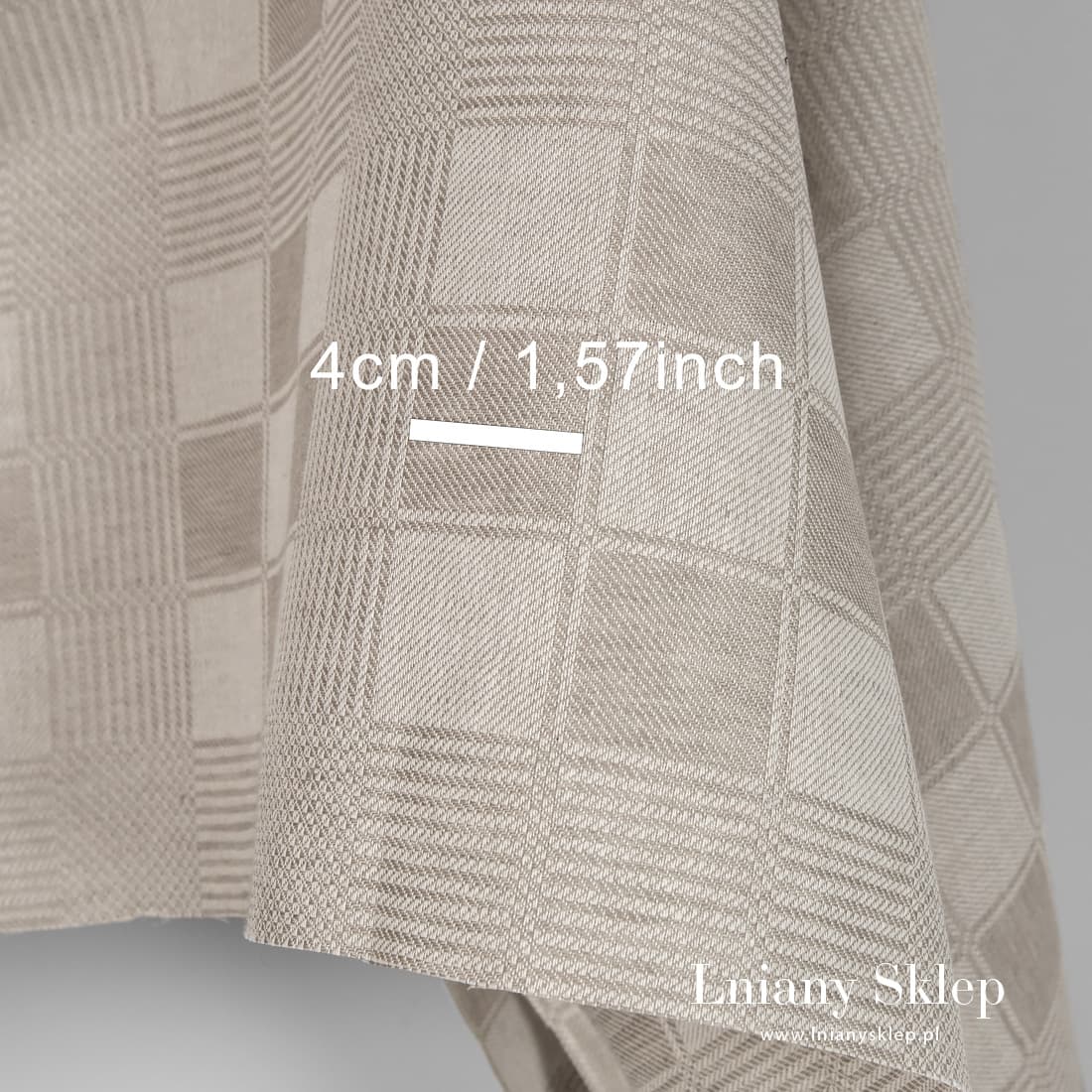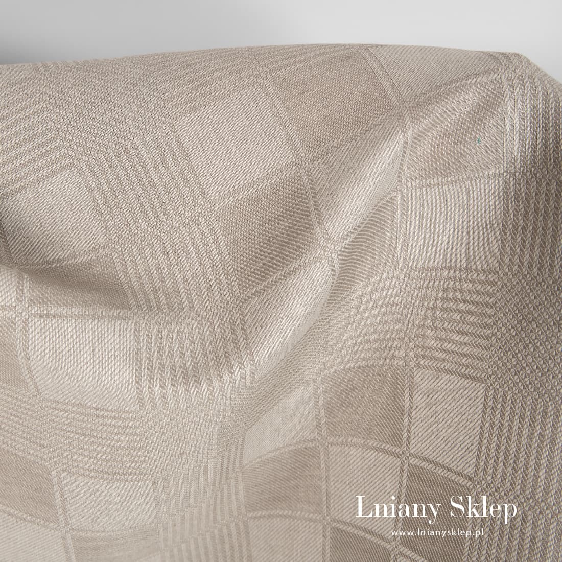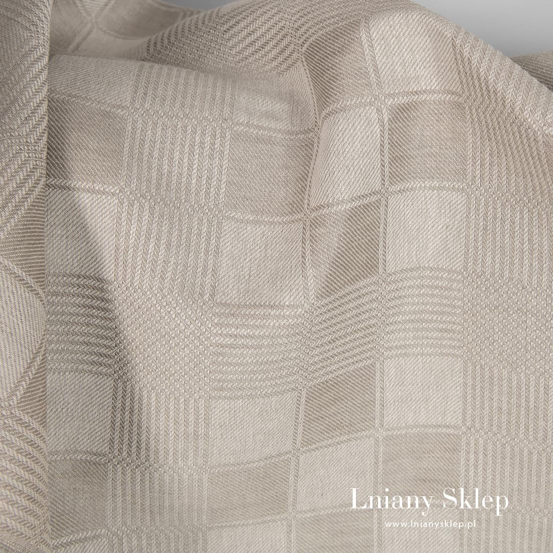Szara w kratkę tkanina żakardowa len z bawełną wytkana splotem skośnym z przędzy piaskowej lnianej i białej bawełnianej w kratkę. Tkanina średnio ciężka, gęsta na szycie fartuchów kuchennych, obrusów, serwetek i in.