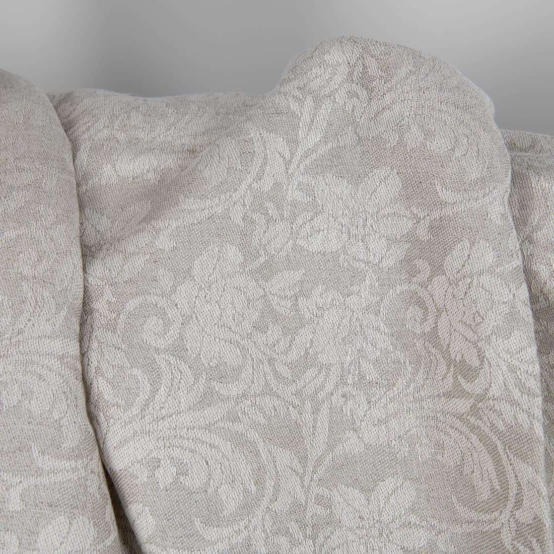 Żakardowa tkanina lniano-bawełniana. Szare tło ozdobione zostało wytkanym wzorem białych kwiatów. Jakościowa, gęsta i wytrzymała tkanina lniana odpowiednia na szycie zasłon, obrusów, narzut na łóżka, konfekcji stołowej i najróżniejszych akcesoriów.