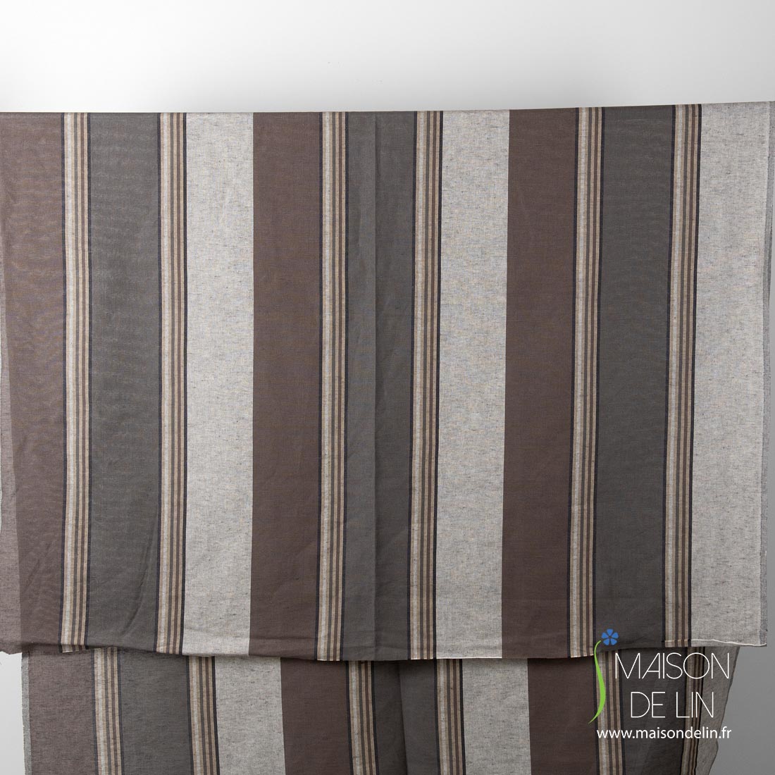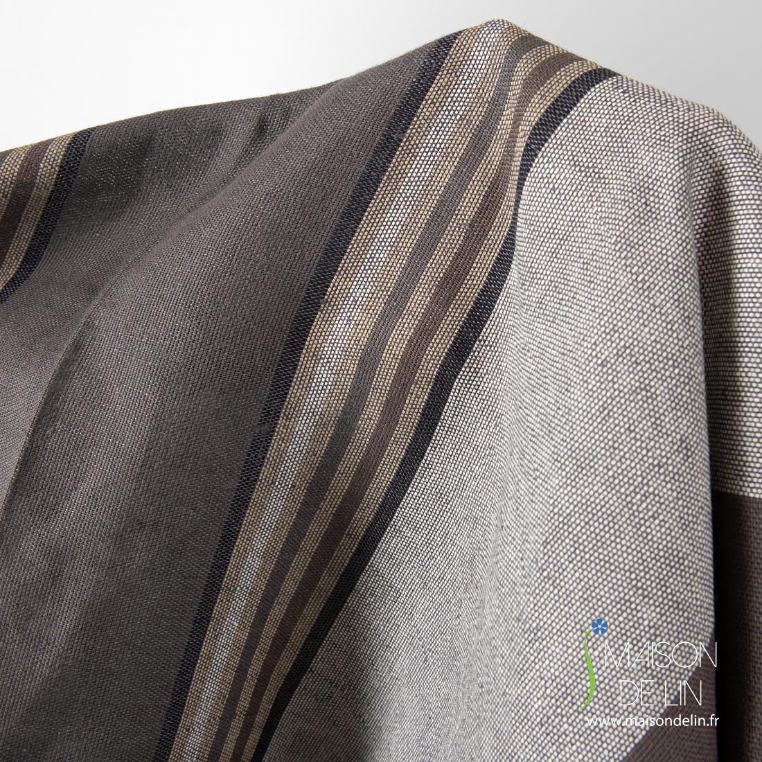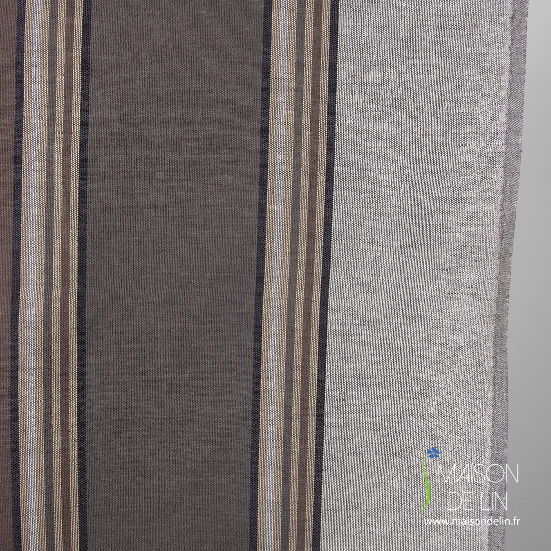 Szara tkanina lniano - bawełniana w pasy brązowe, mlecznobiałe (lekko żółtawe), czarne i piaskowe biegnące pionowo. Mocna, gęsta, średnio gruba. Pasuje na szycie odzieży, tekstyliów domowych i in.