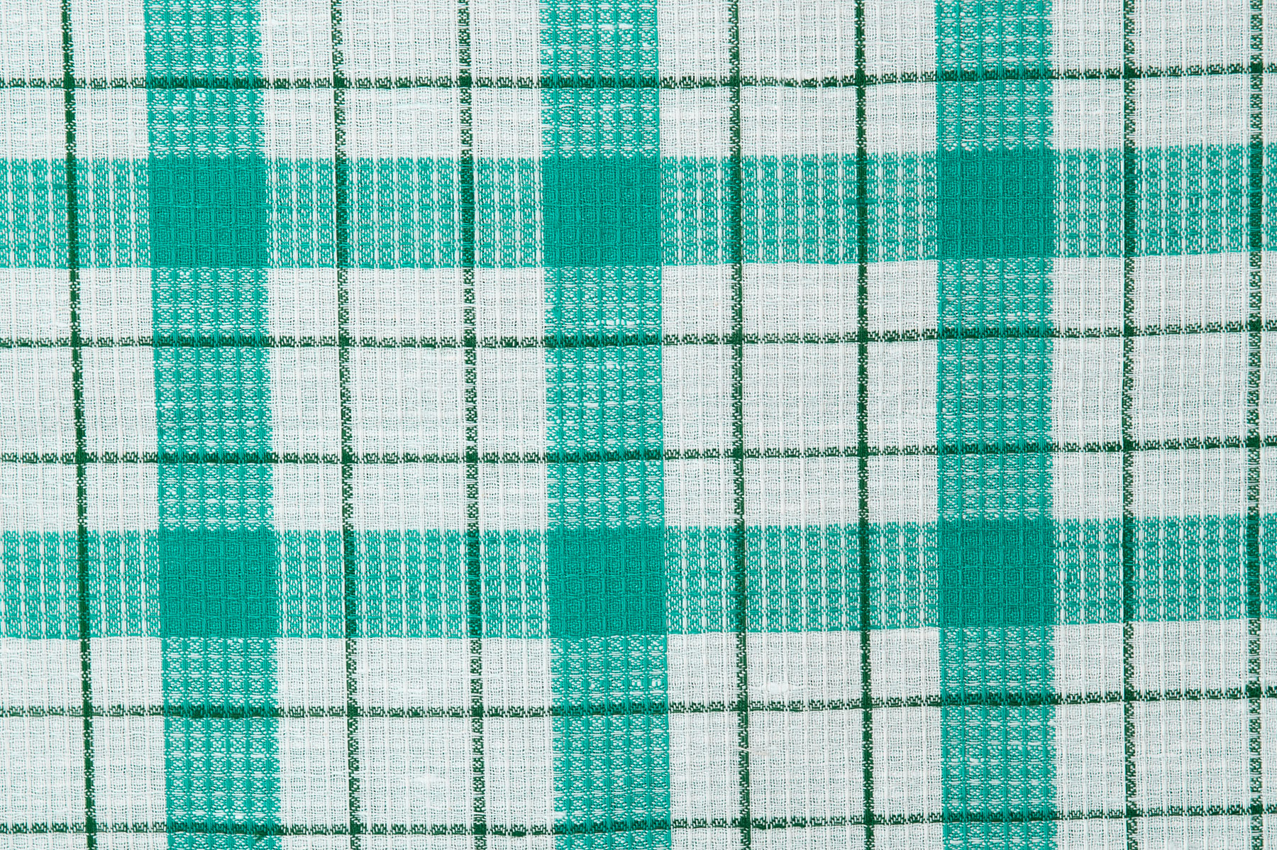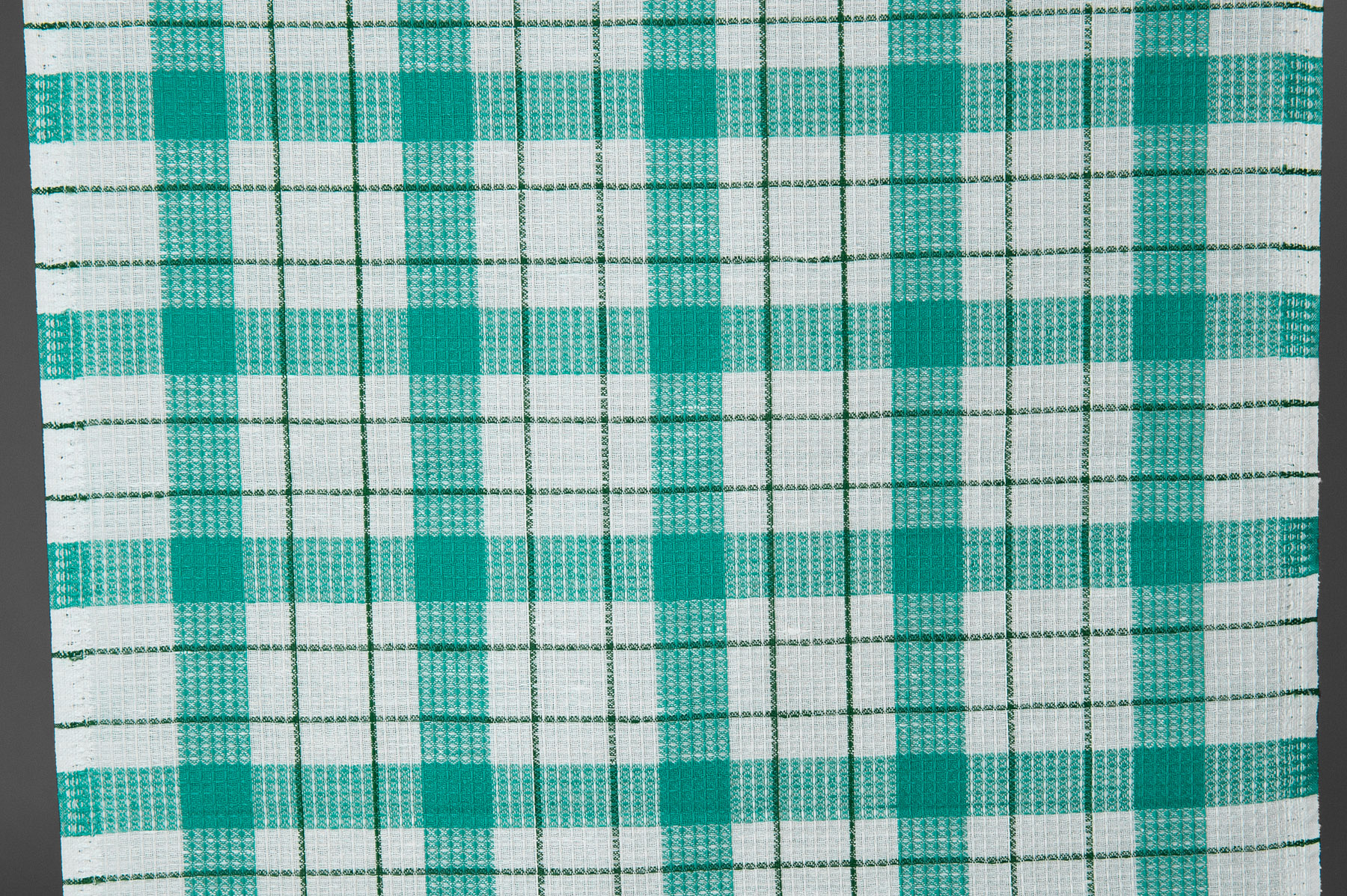 Tkanina lniano - bawełniana wytkana w zielono - białą kratkę z przędzy śnieżnobiałej i zielonej. Do wytkania tej średnio ciężkiej tkaniny użyto splotu waflowego.