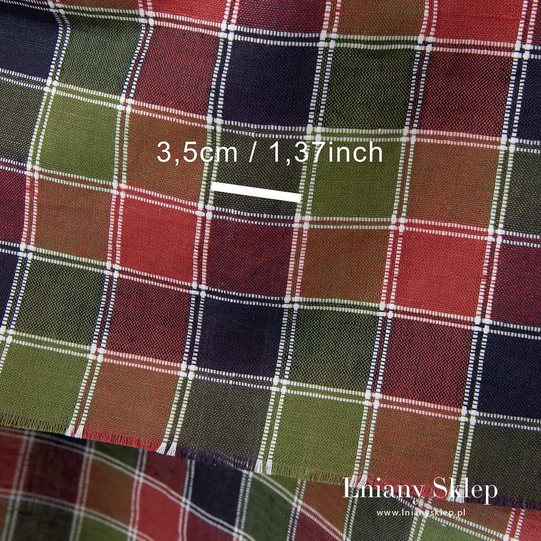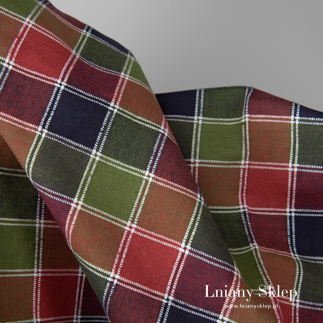 Tkanina lniano - bawełniana wytkana w granatowo - zielono - czerwoną kratkę. Kolorowe okienka są obramowane podwójnymi białymi paskami. Mocna, gęsta, średnio ciężka tkanina.