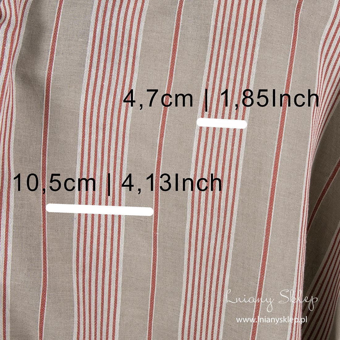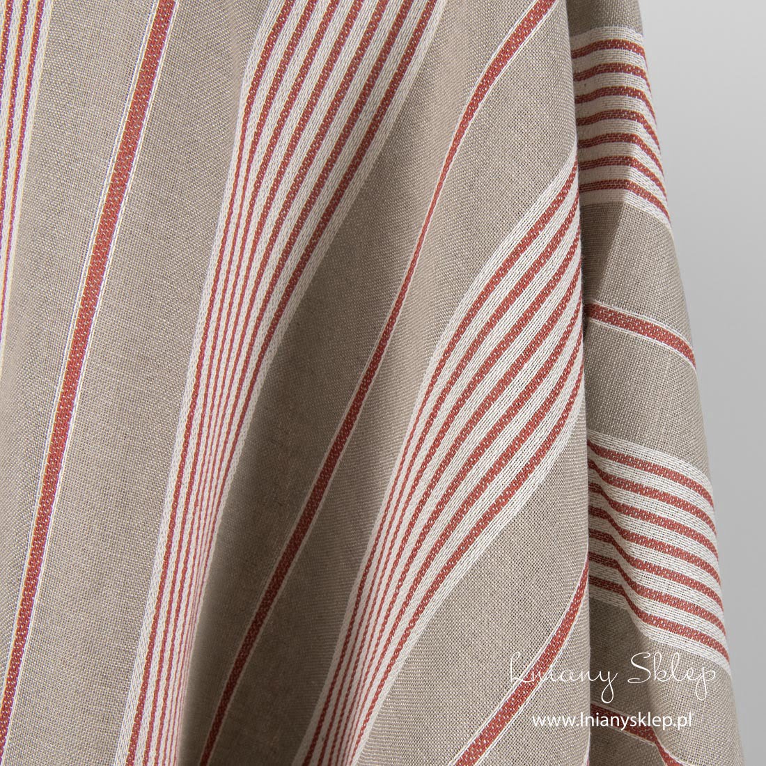 Tkanina w pasy len z domieszką bawełny. Na szarym tle, wytkanym splotem płóciennym z bawełnianej szarej i lnianej niebarwionej (szarej o piaskowym odcieniu) przędzy pionowo wytkaliśmy lekko wypukłym splotem czerwone i białe pasy. Mocna, lekka, gesta tkanina.
